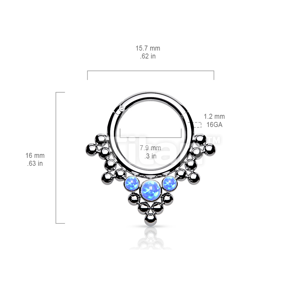 Implant Grade Titanium Hinged Segment Hoop Ring With 3 Bezel Set Opals and Clustered Tribal Beads