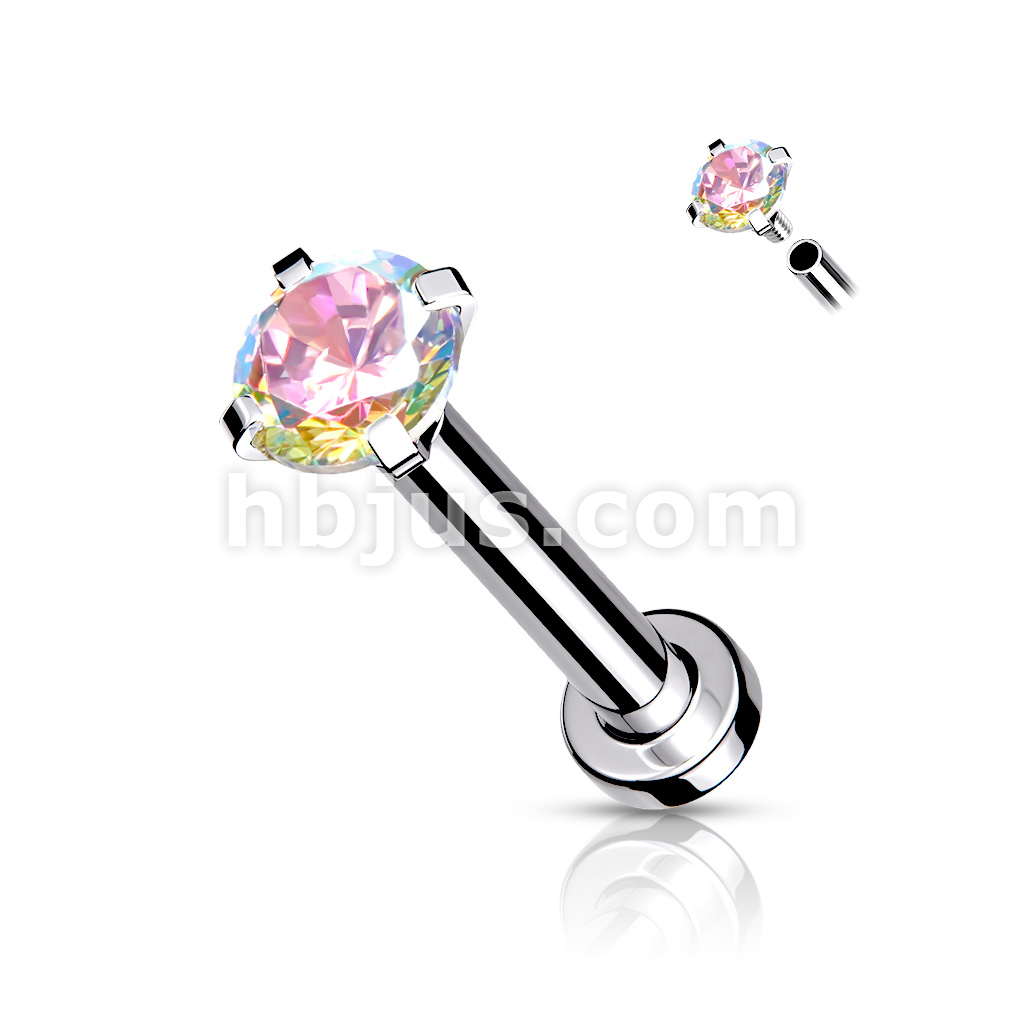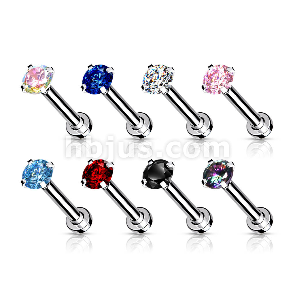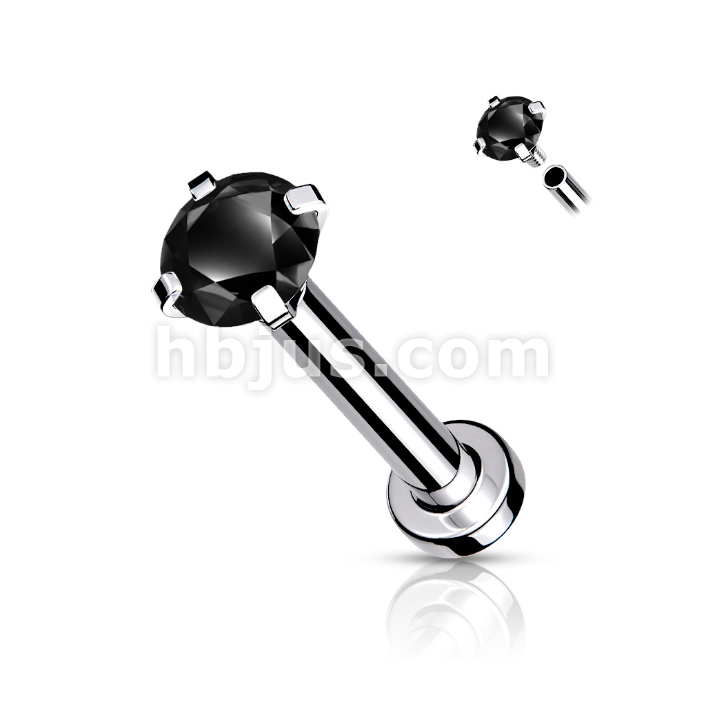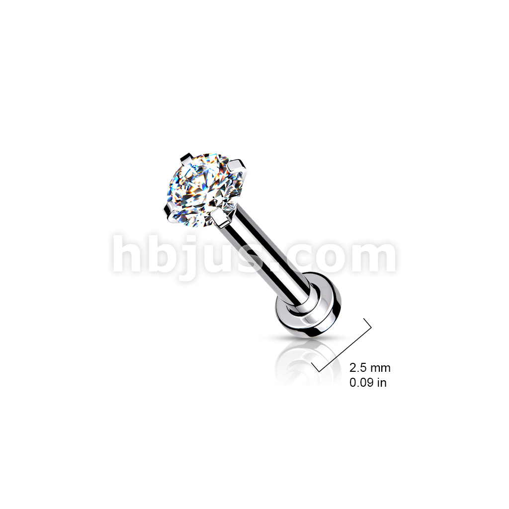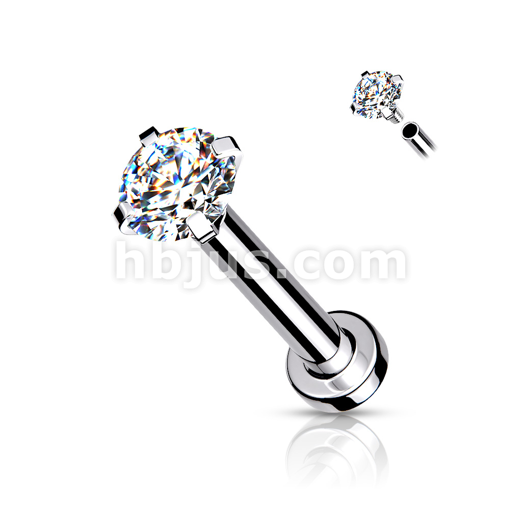 CZ Prong Set Top Internally Threaded 316L Surgical Steel Labret, Flat Back Studs For Lip, Chin, Nose and More
