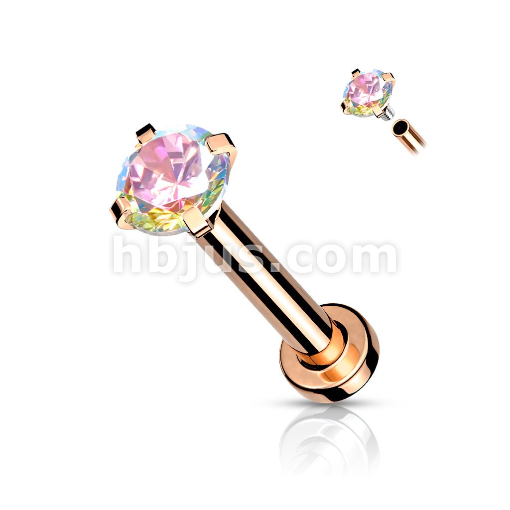 CZ Prong Set Top Internally Threaded PVD Over Micro Base 316L Surgical Steel Labret, Flat Back Studs For Lip, Chin, Nose and More