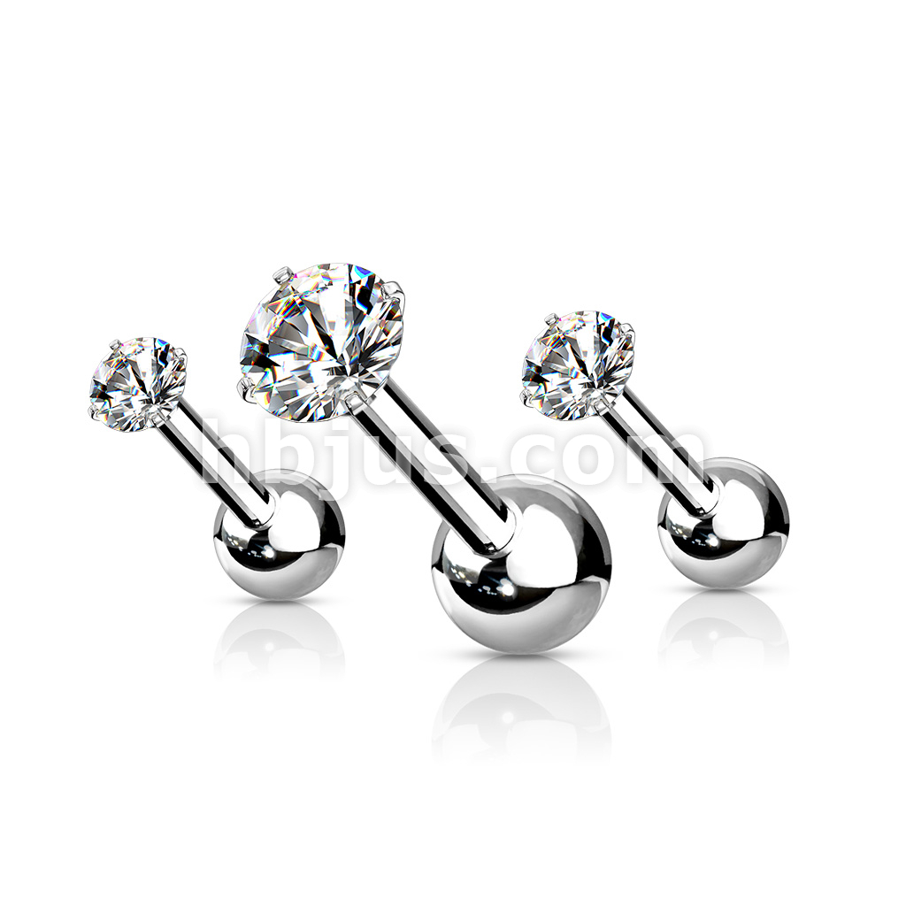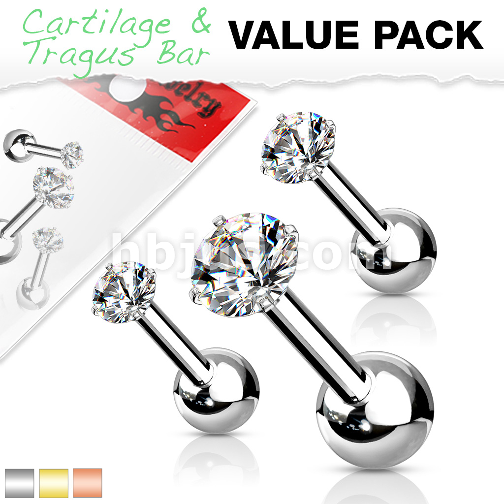 3 Pcs Value Pack of Assorted 316L Cartilage/Tragus Bar with Prong Set CZ Top