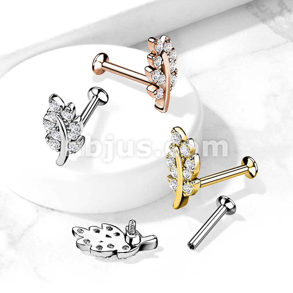CZ Paved Leaf Top on Internally Threaded 316L Surgical Steel Flat Back Studs for Labret, Monroe, Cartilage and More