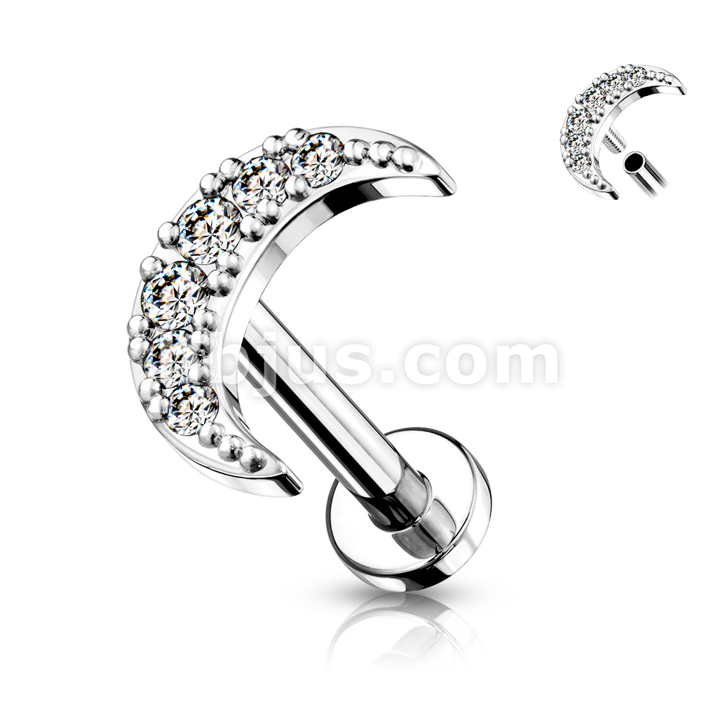 CZ Paved Crescent Moon Top on Internally Threaded 316L Surgical Steel Flat Back Studs for Labret, Monroe, Cartilage and More