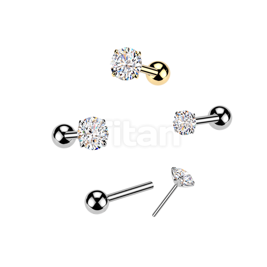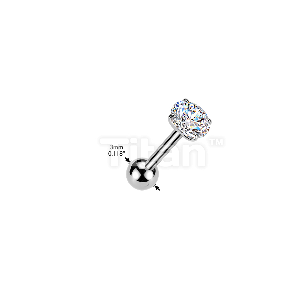 Implant Grade Titanium Threadless Push In Cartilage Barbell With Prong Set CZ Top
