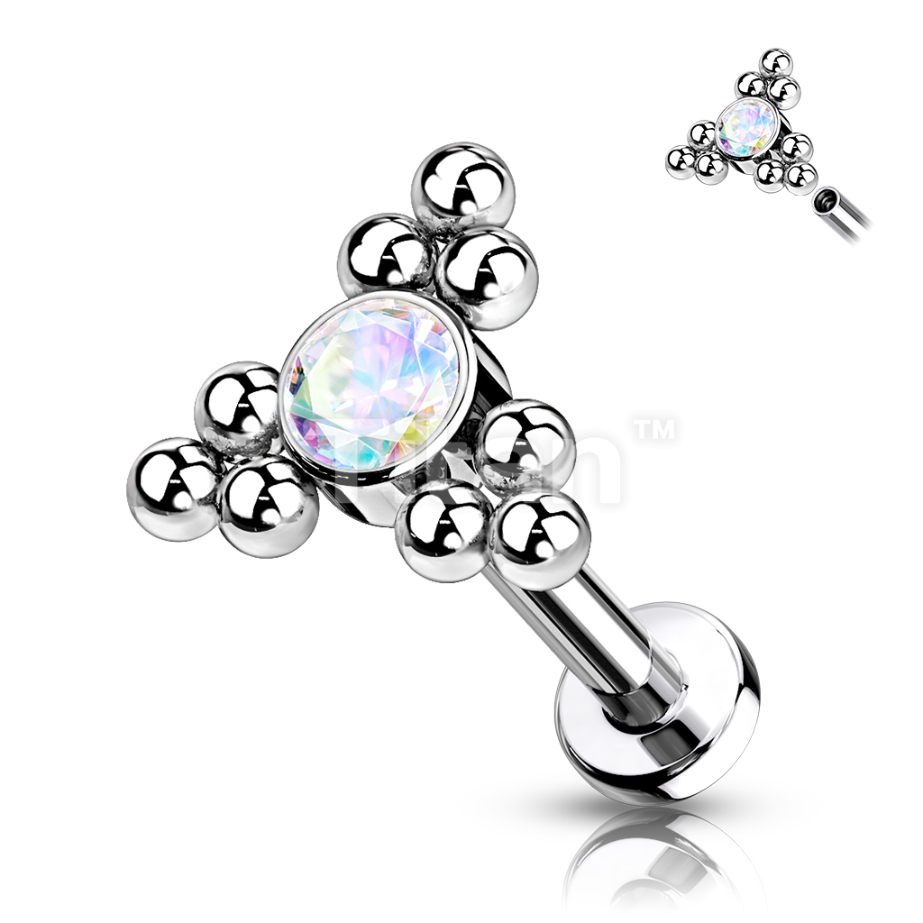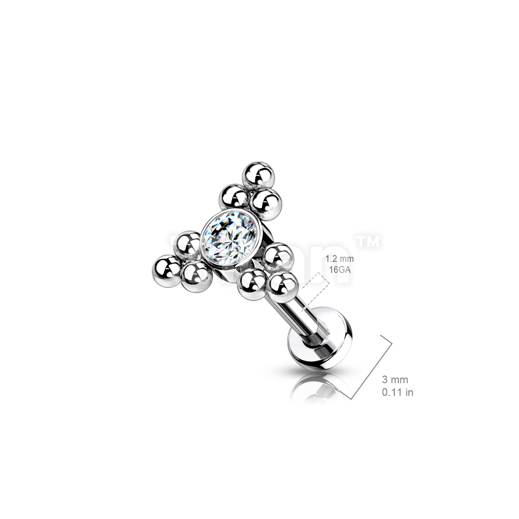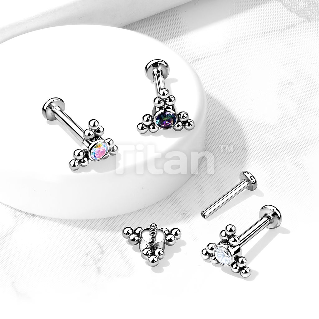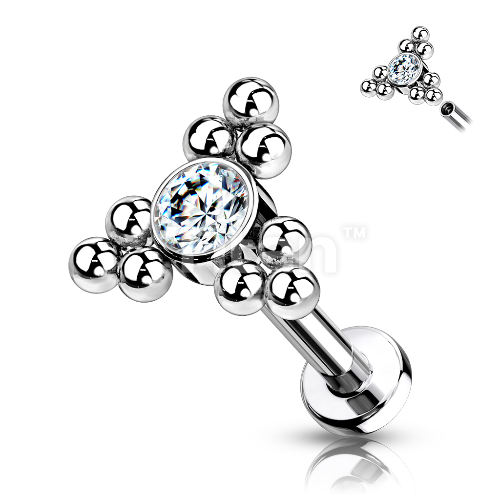 Implant Grade Titanium Internally Threaded Labret With Bezel Set CZ Center and Trinity Ball Clusters Top