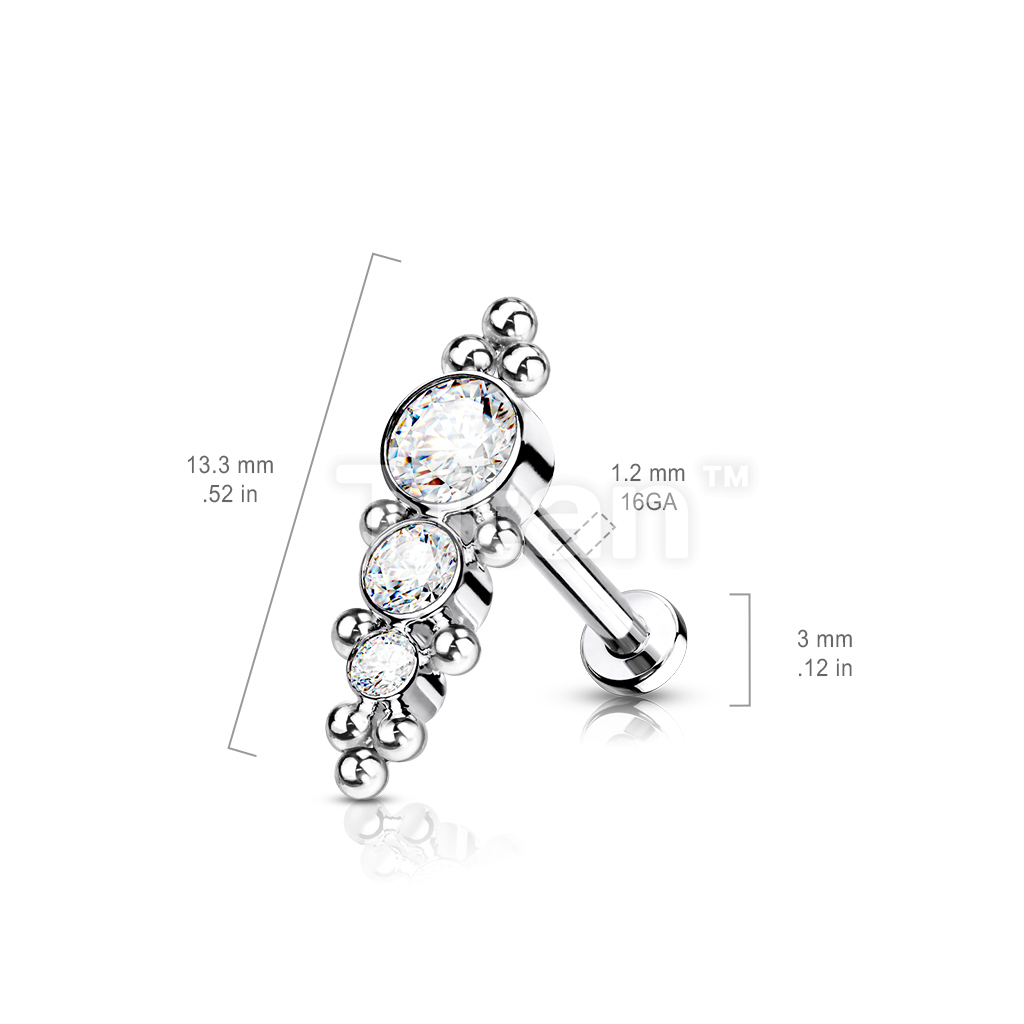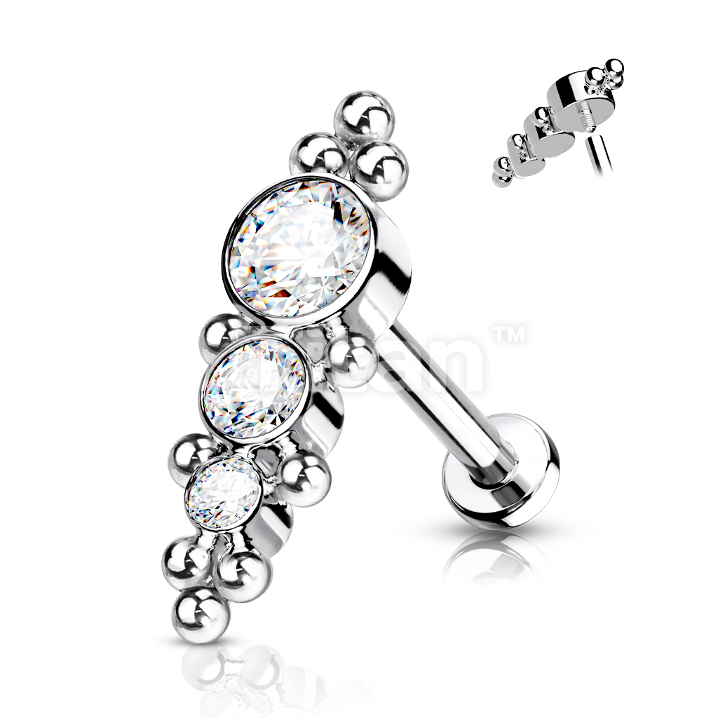 Implant Grade Titanium Internally Threaded Labret With 3 Descending CZs and Ball Clusters Top