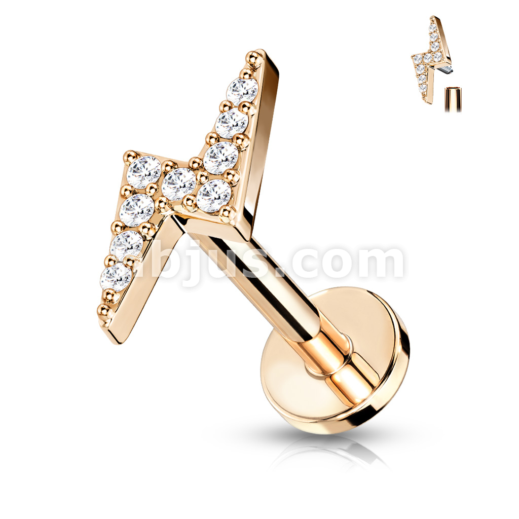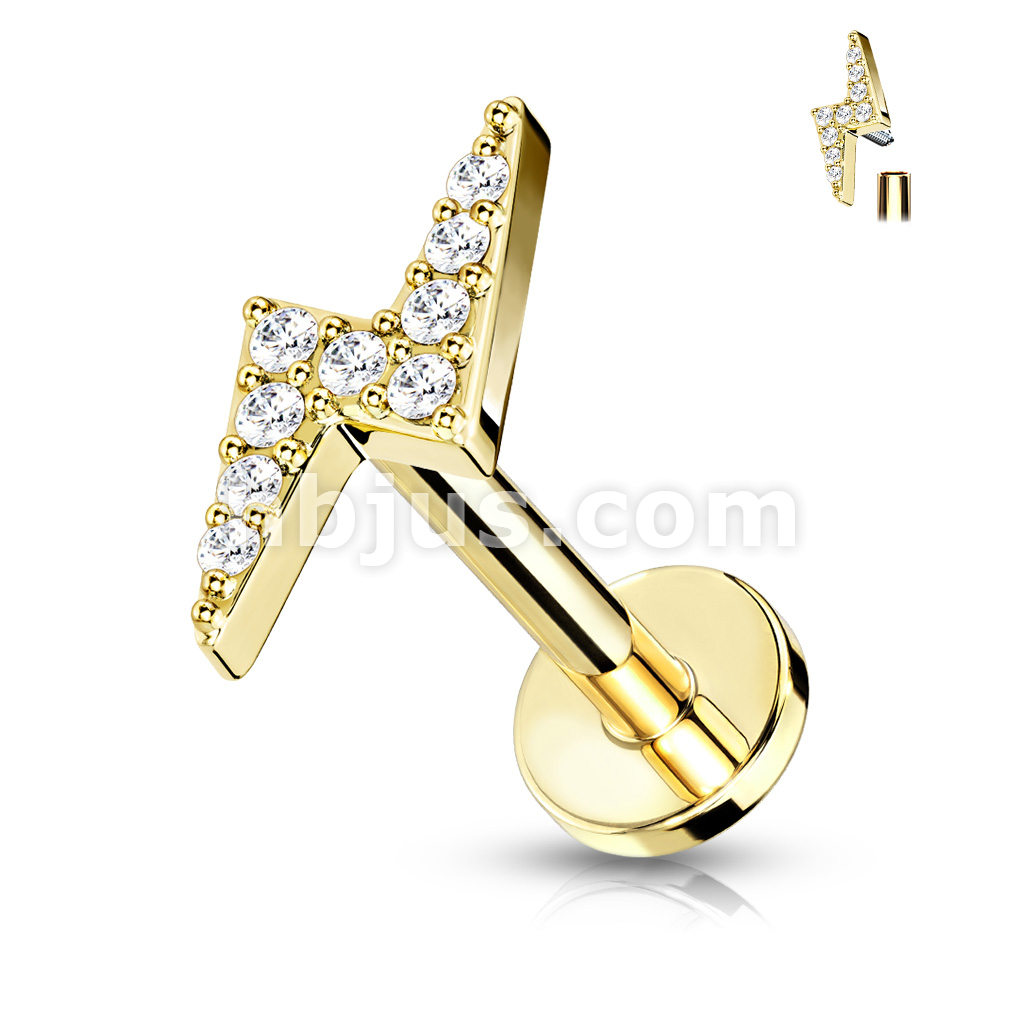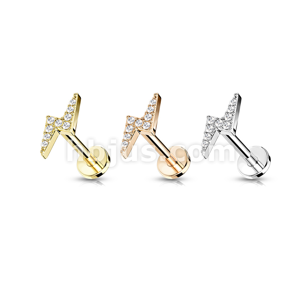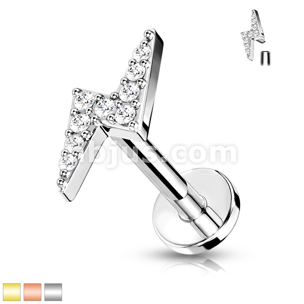 Lightning Bolt Paved With Round CZ Top Internally Threaded 316L Surgical Steel Flat Back Studs for Cartilage, Labret, and More