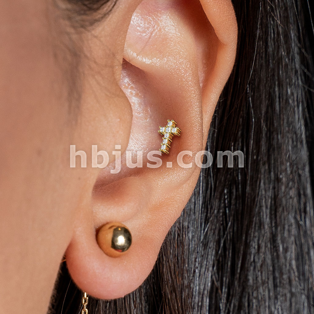 Round CZ Paved Cross Top Internally Threaded 316L Surgical Steel Flat Back Studs for Cartilage, Labret, and More