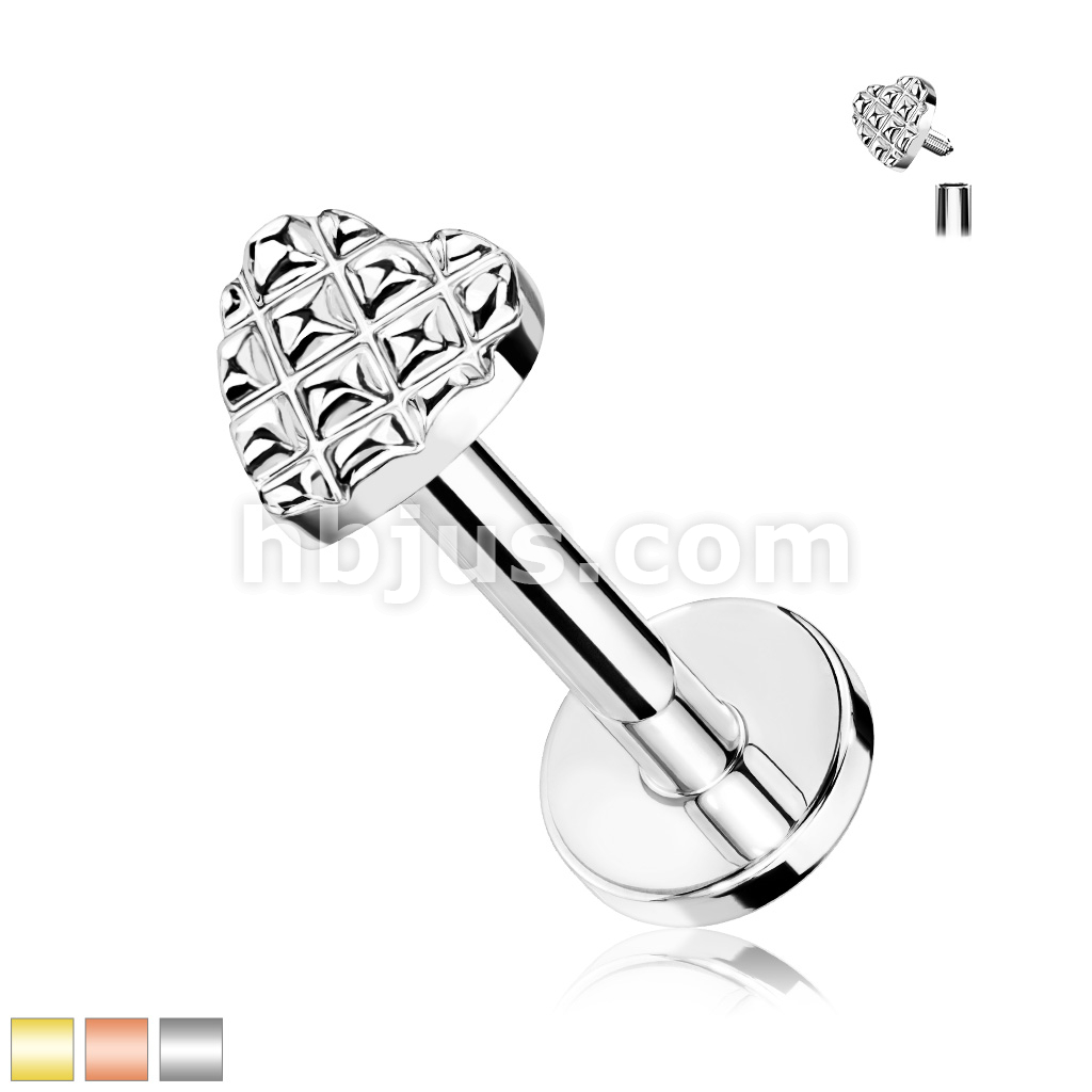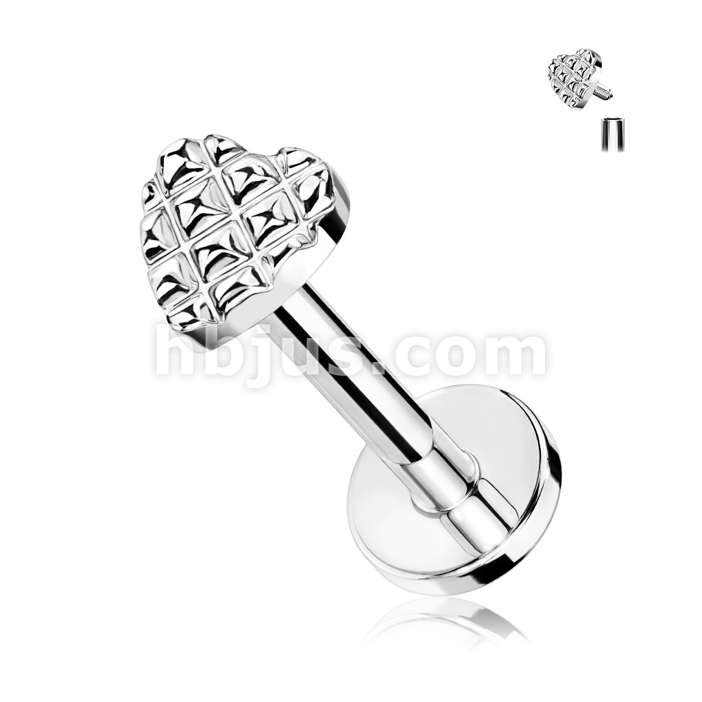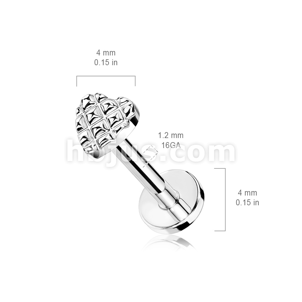 Diamond Embossed Heart 316L Surgical Steel Internally Threaded Labret, Monroe, Cartilage Stud Rings