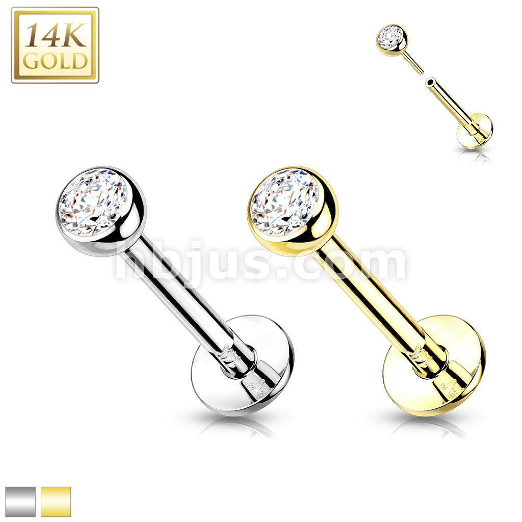 14K Gold Threadless Push-in Labret, Flat Back Studs With Bezel Set CZ Top for Cartilage, Monroe and More