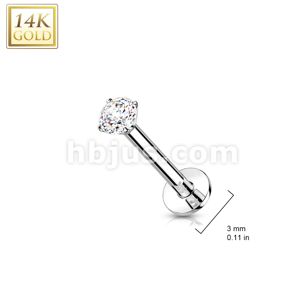 14K Gold Threadless Push-in Labret, Flat Back Studs With Prong Set CZ Top for Cartilage, Monroe and More