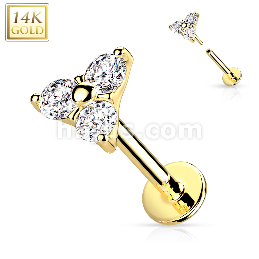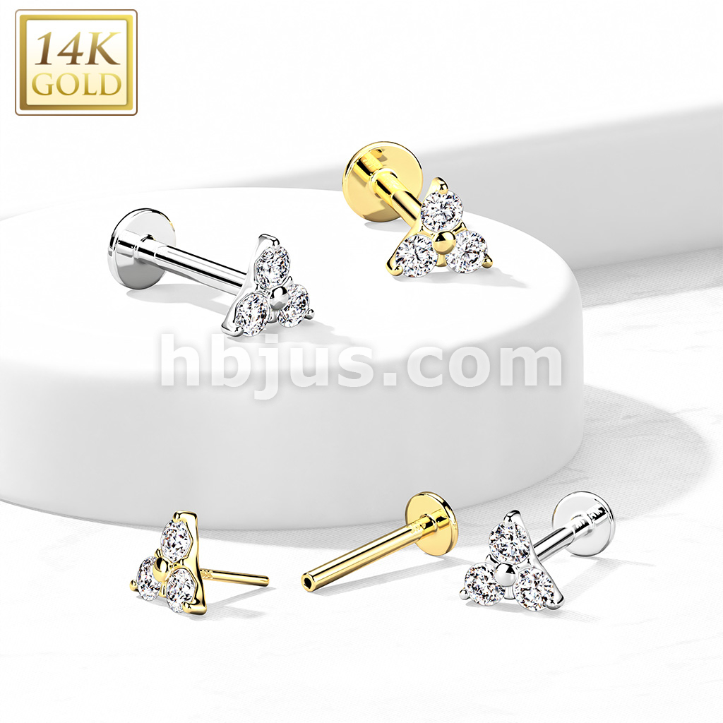 14K Gold Threadless CZ Set Triangle Top Labret, Flat back Stud.