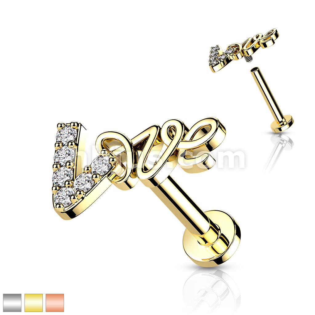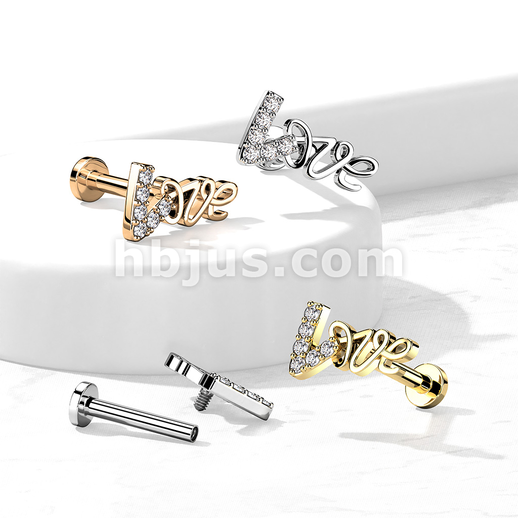 Love With CZ Paved Top on Internally Threaded 316L Surgical Steel Flat Back Studs for Labret, Monroe, Cartilage and More