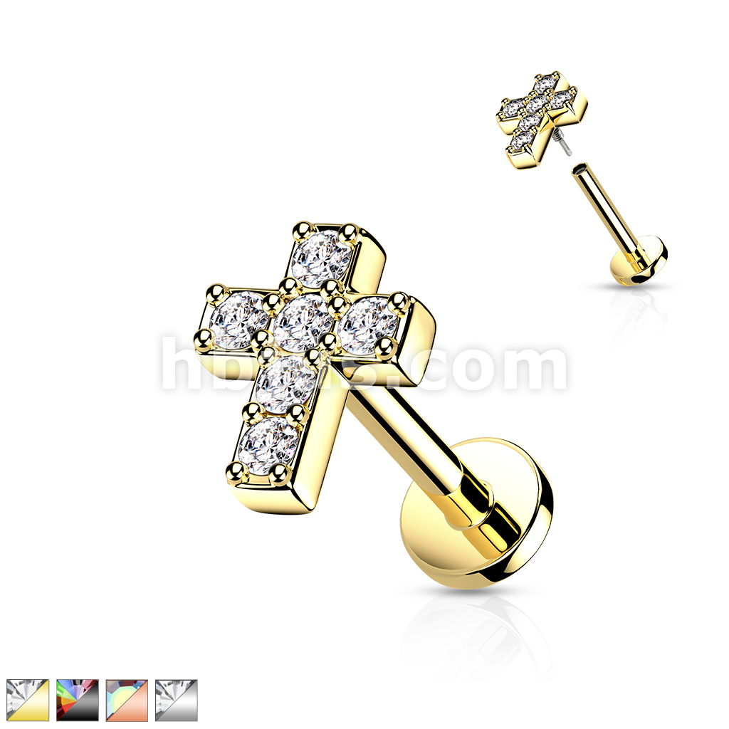 6 CZ Cross Top With Internally Threaded All 316L Surgical Steel Flat Back Studs With Extended Threading for Labret, Monroe, Cartilage and More
