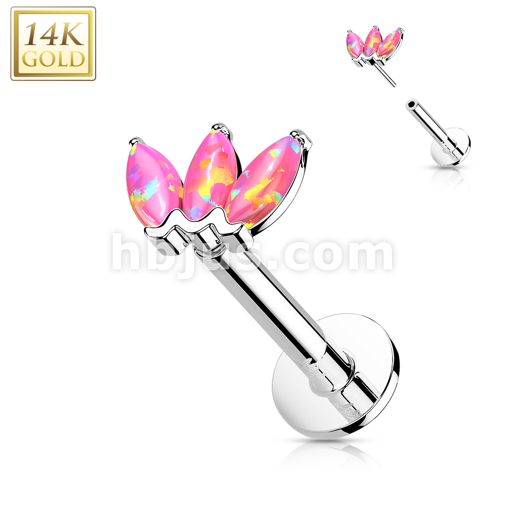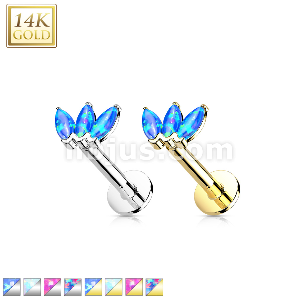 14K Gold Threadless Labret/Flat Back Stud with 3-Marquise Opal Top