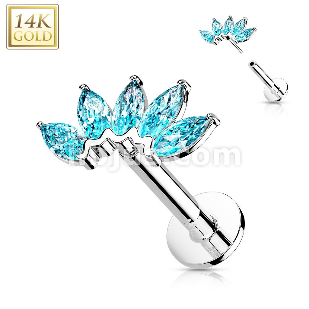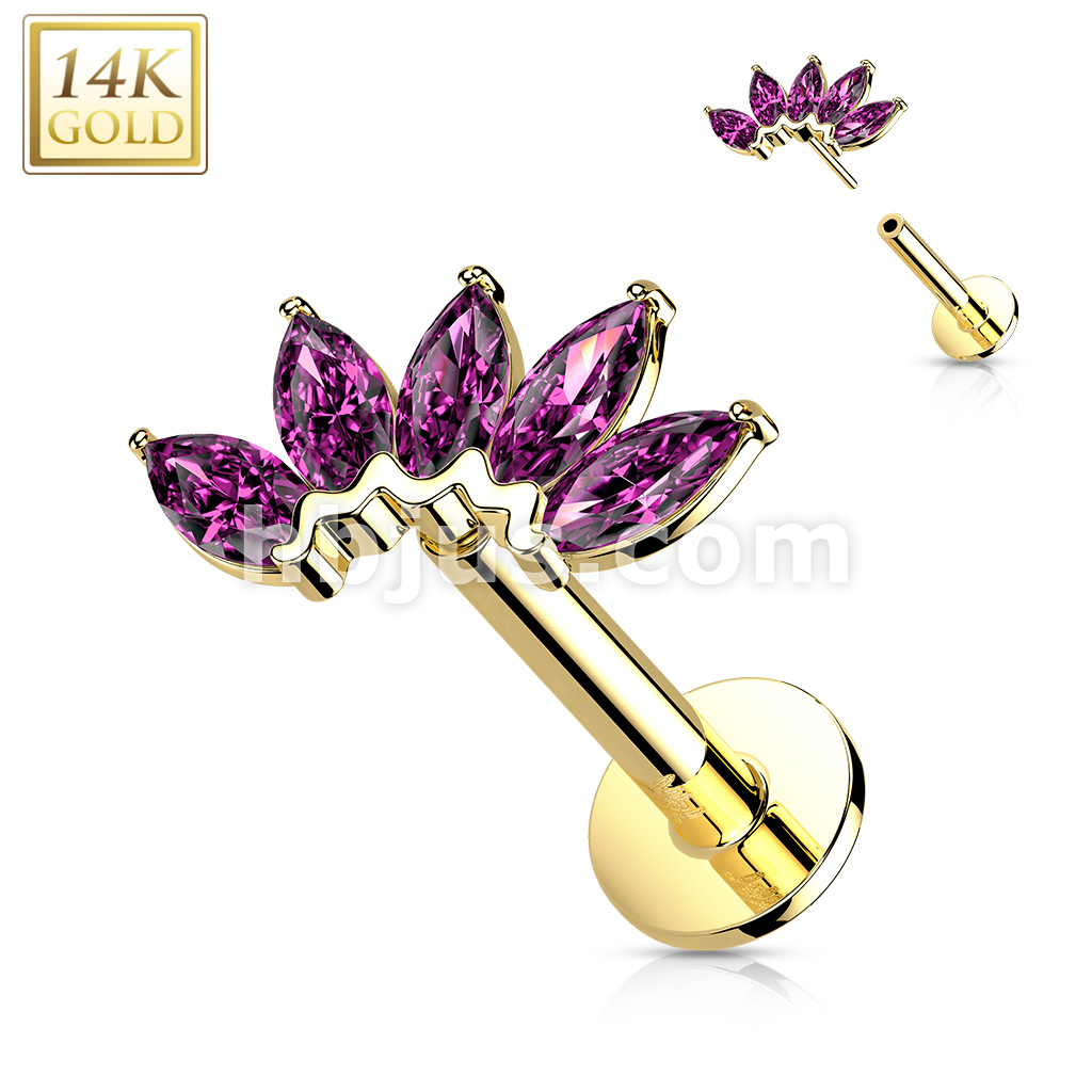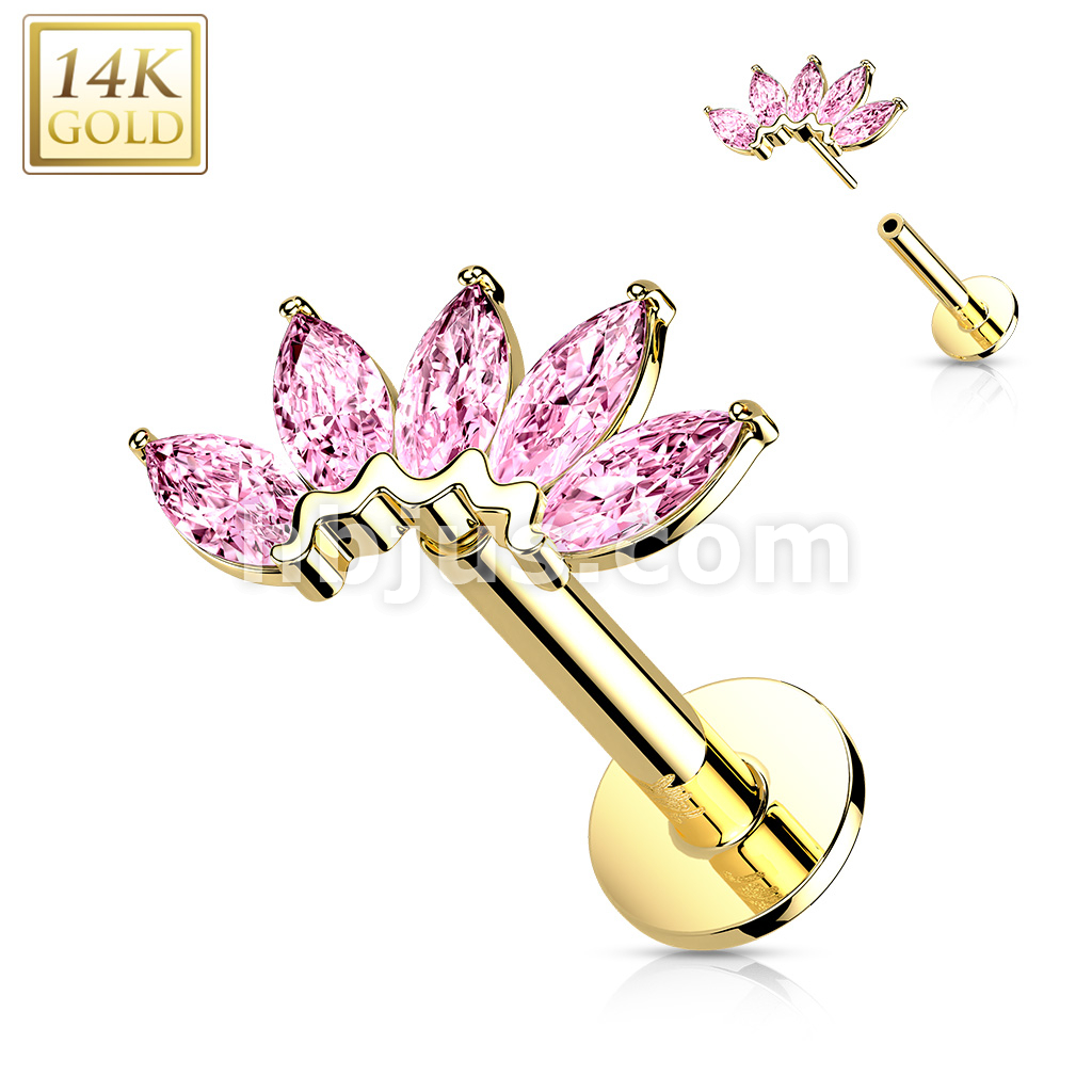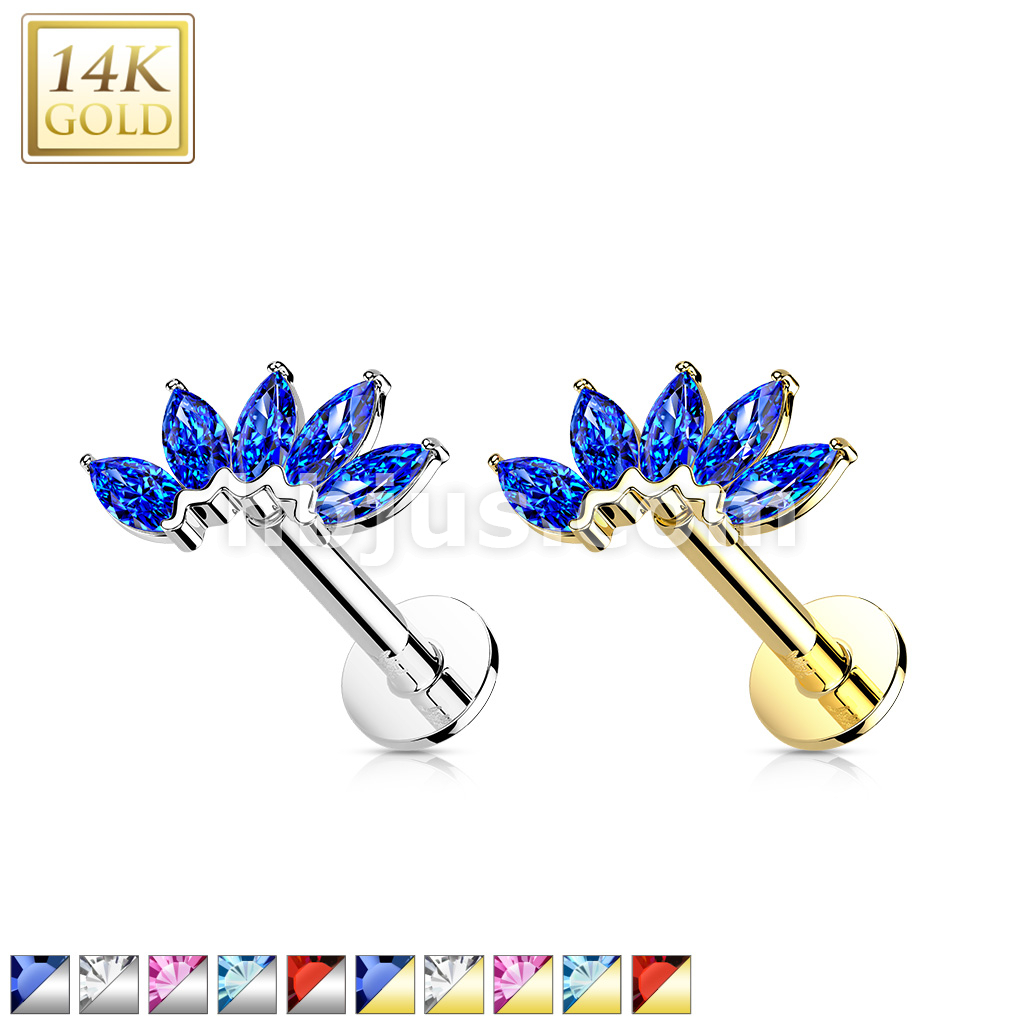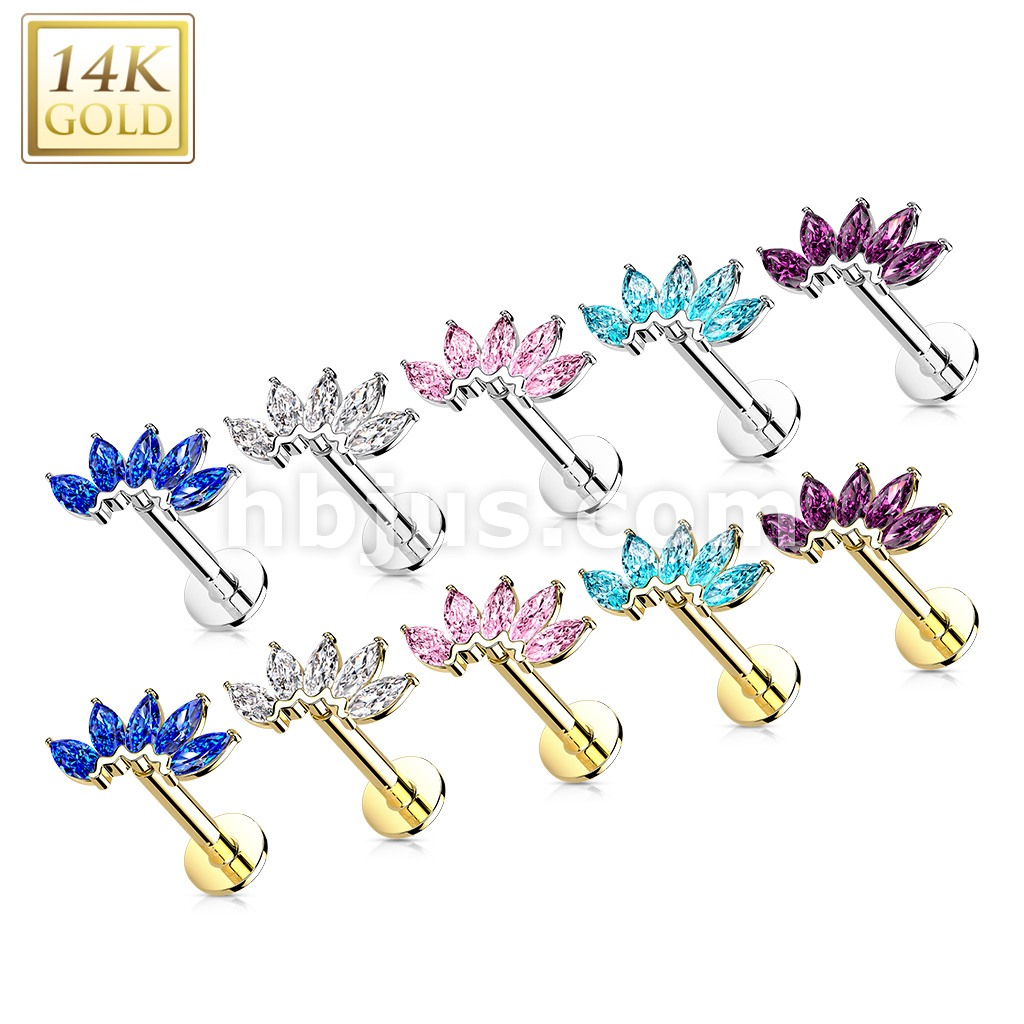 14K Gold Threadless Labret/Flat Back Stud with 5-Marquise CZ Fan Top