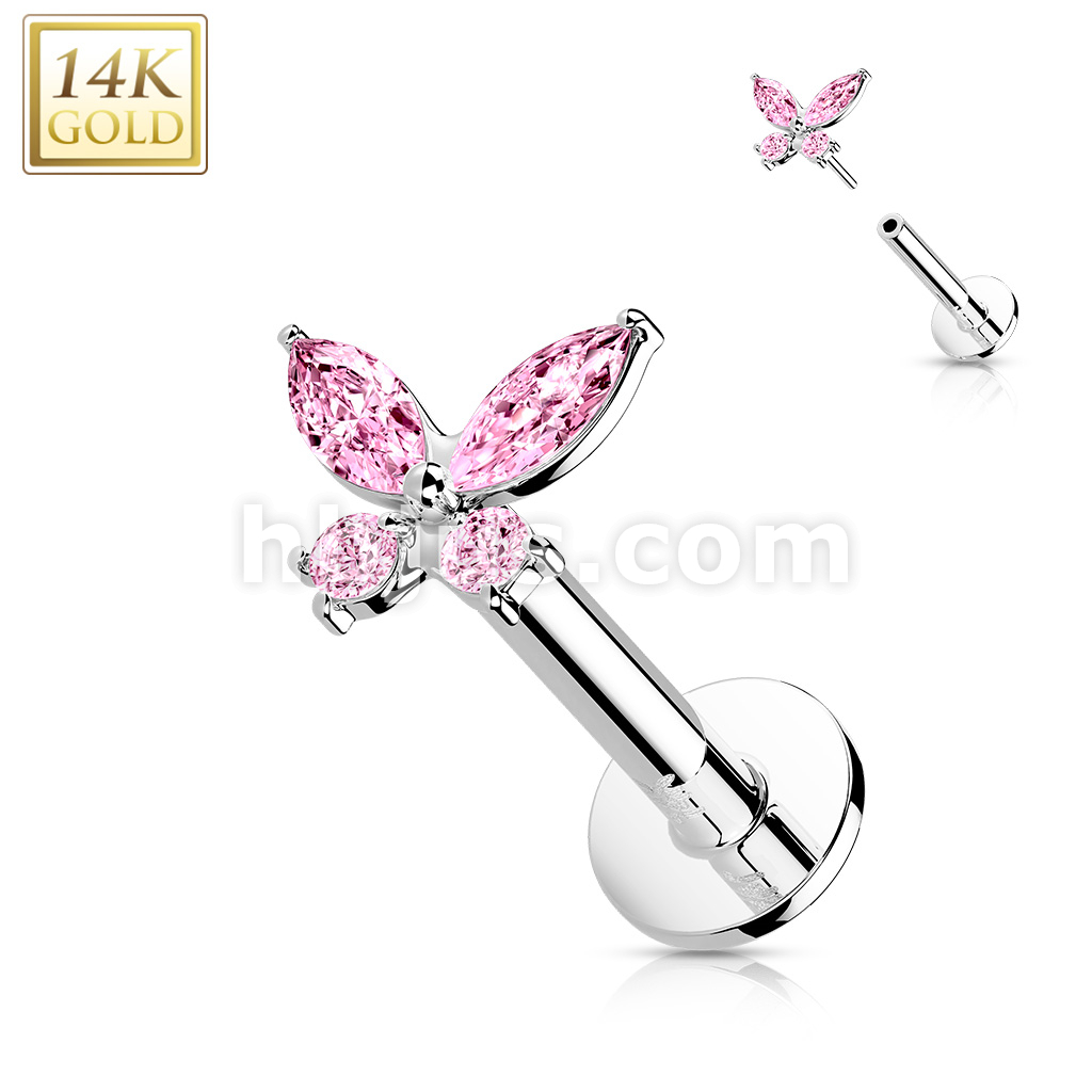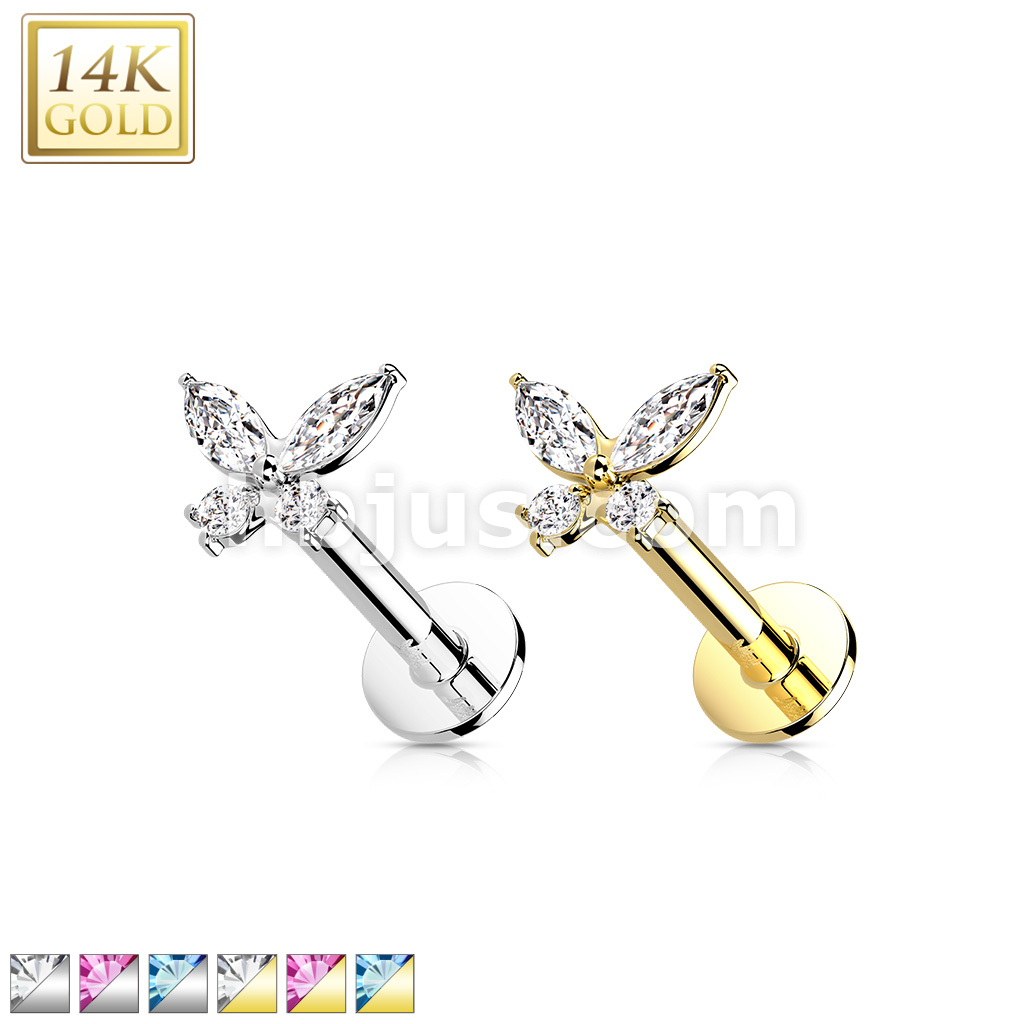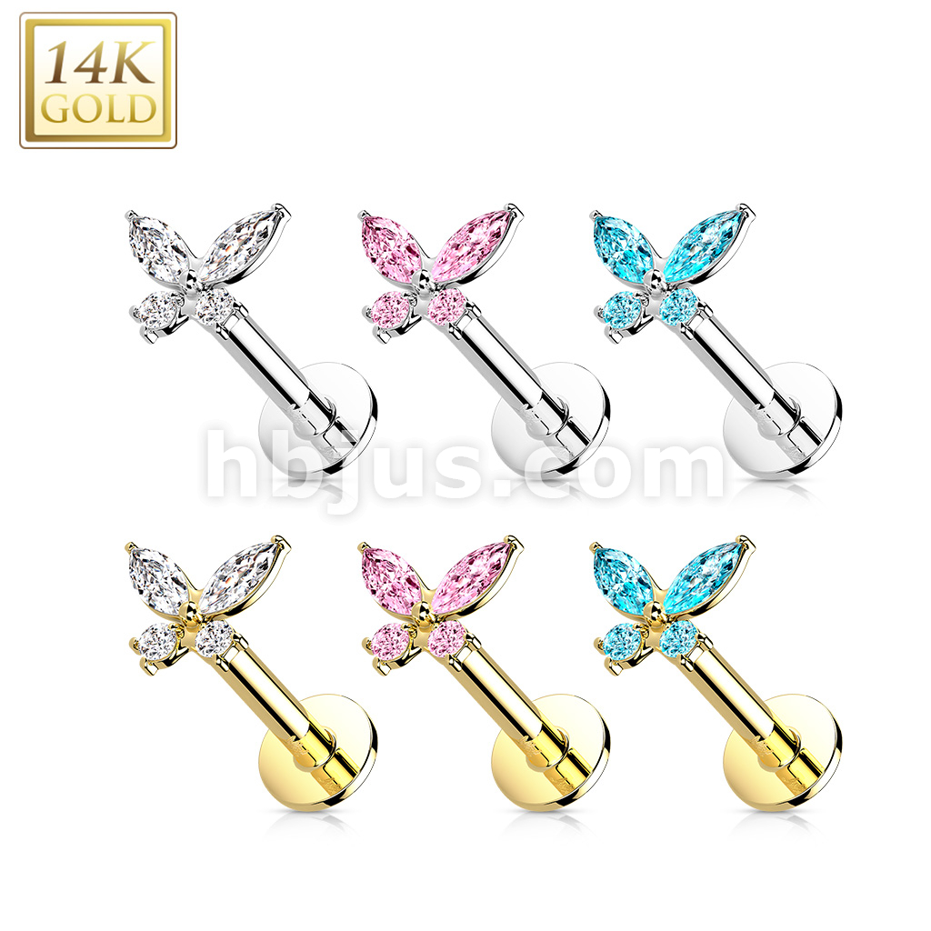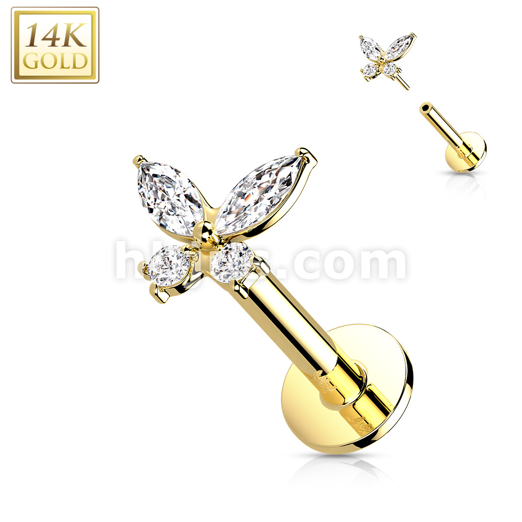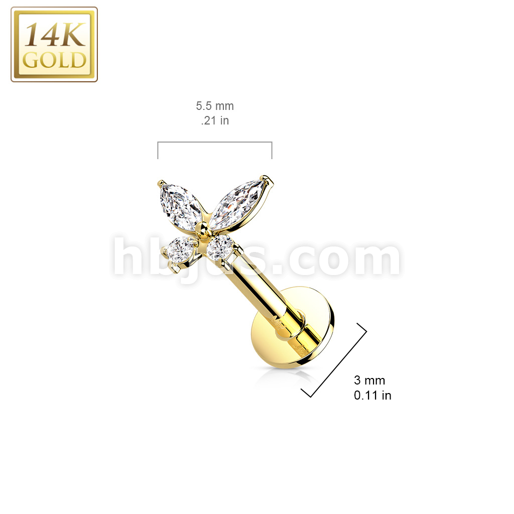 14K Gold Threadless Labret/Flat Back Stud with CZ ButterflyTop