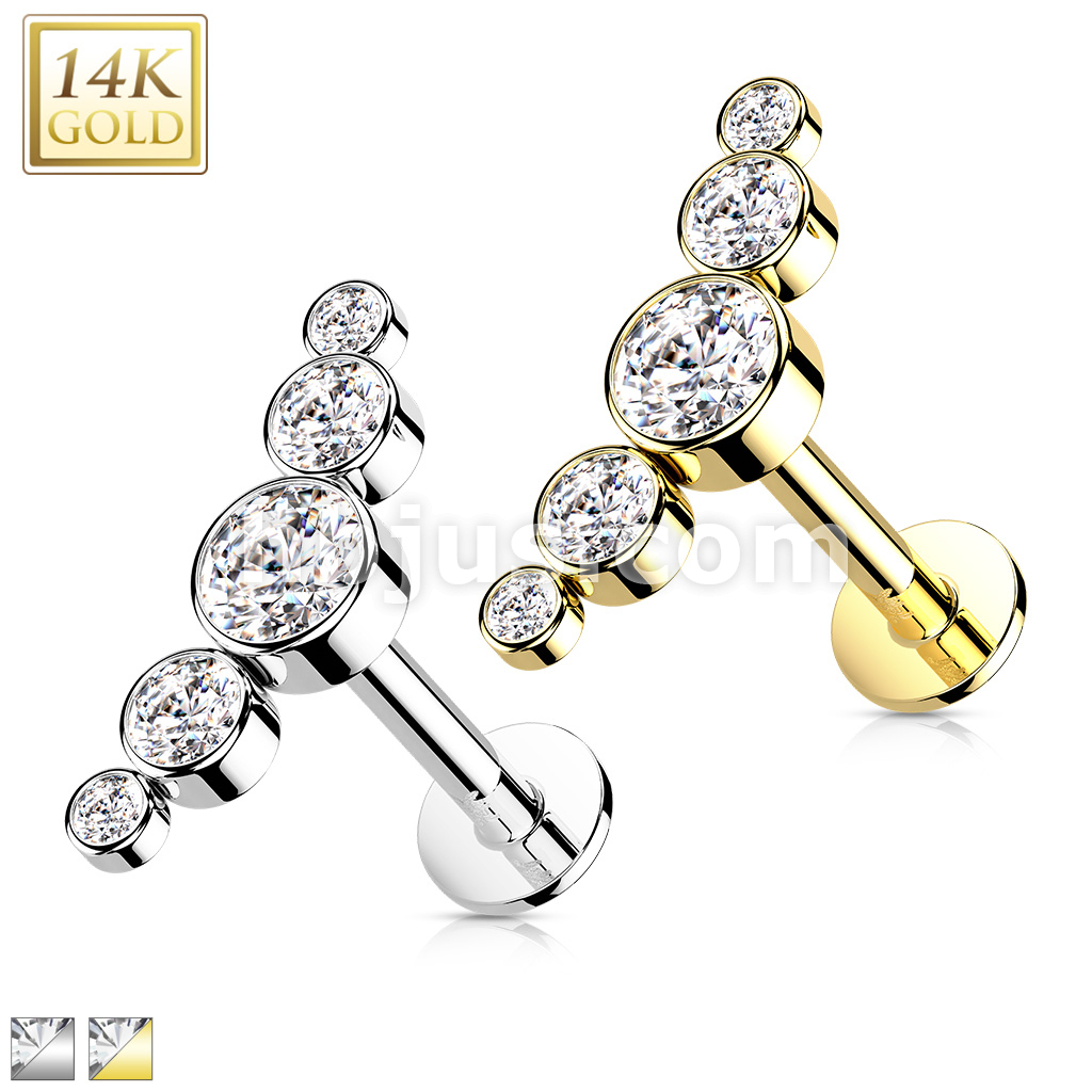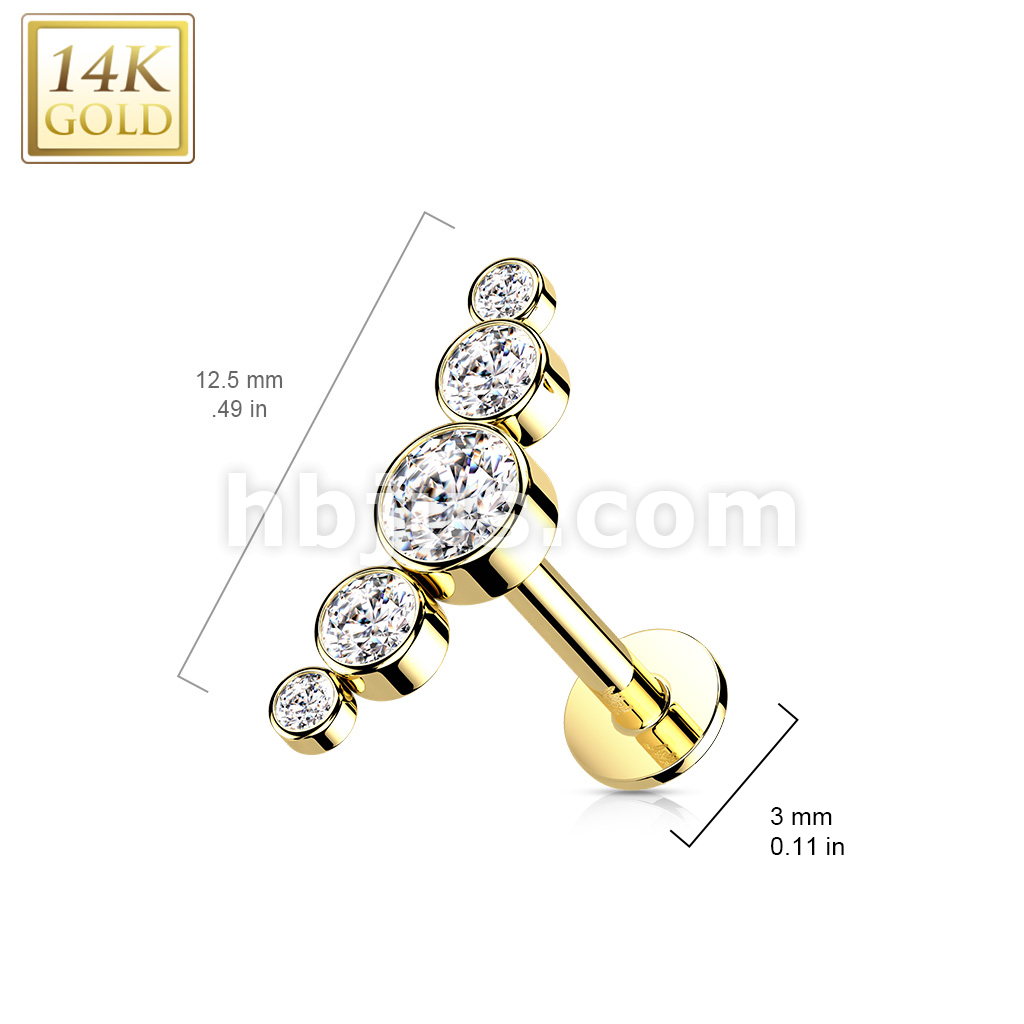 14K Gold Threadless Labret/Flat Back Stud with 5-Round Bezel Set CZ Curve Top