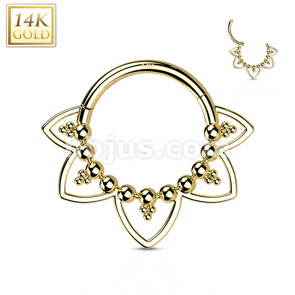 14K Gold Hinged Segment Hoop Ring with Beads and Heart Filigree