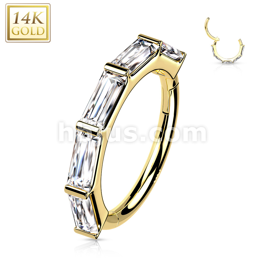 14K Gold Hinged Segment Hoop Ring Lined with Baguette CZ