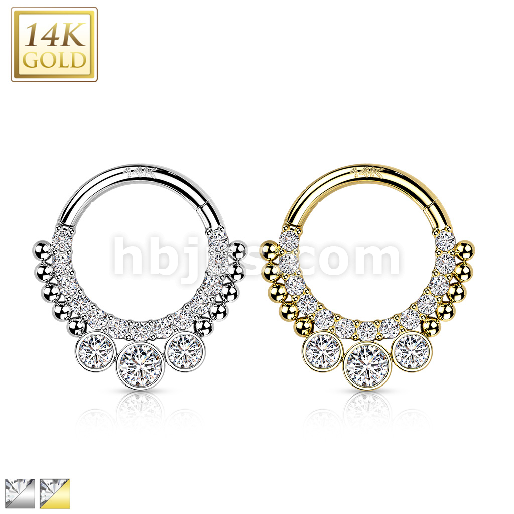 14K Gold Hinged Segment Hoop Rings with CNC Set CZ Paved Front and 3 Bezel Set CZ