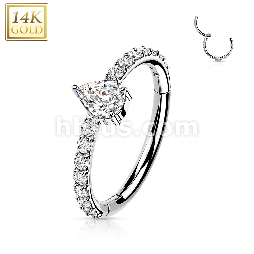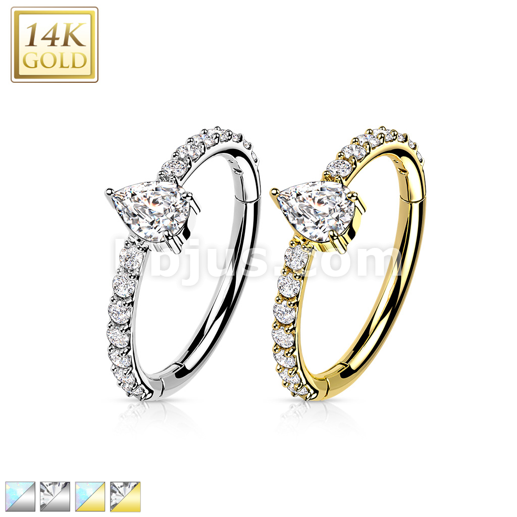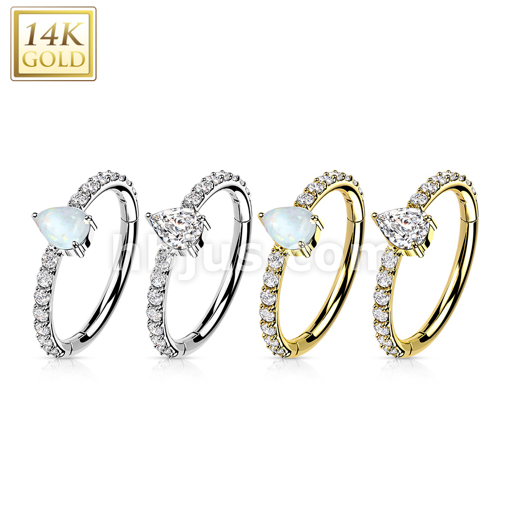 14K Gold Hinged Segment Hoop Ring with CZ Paved and Tear Drop Opal or CZ Center