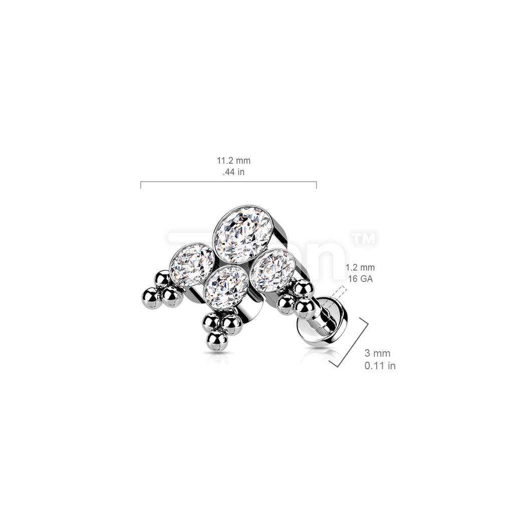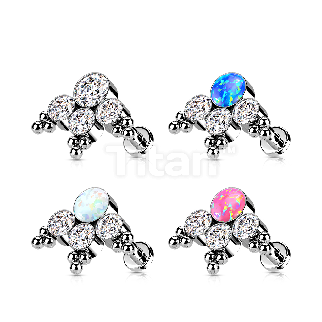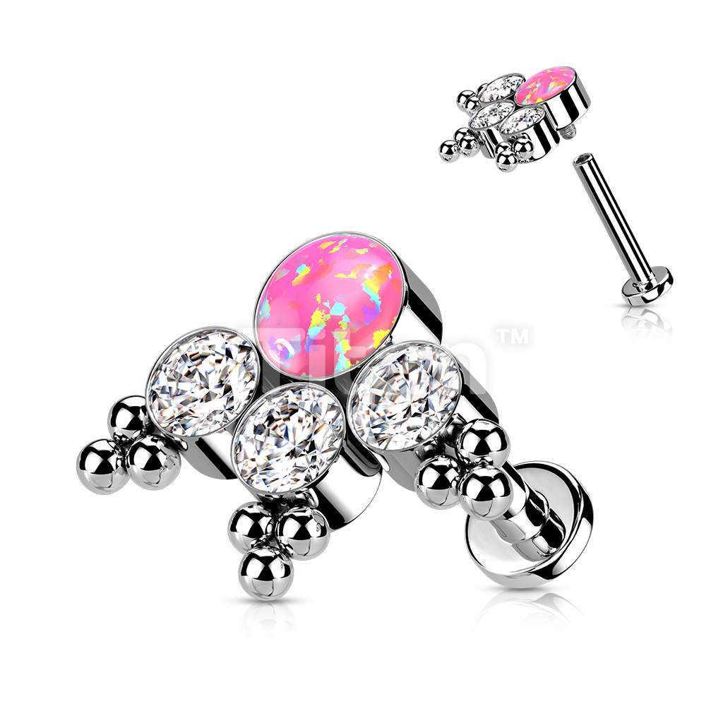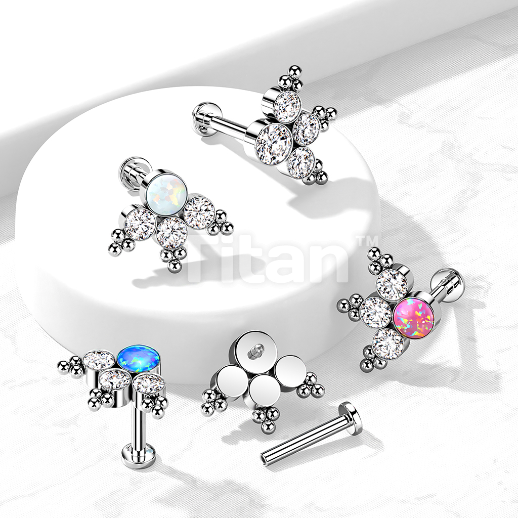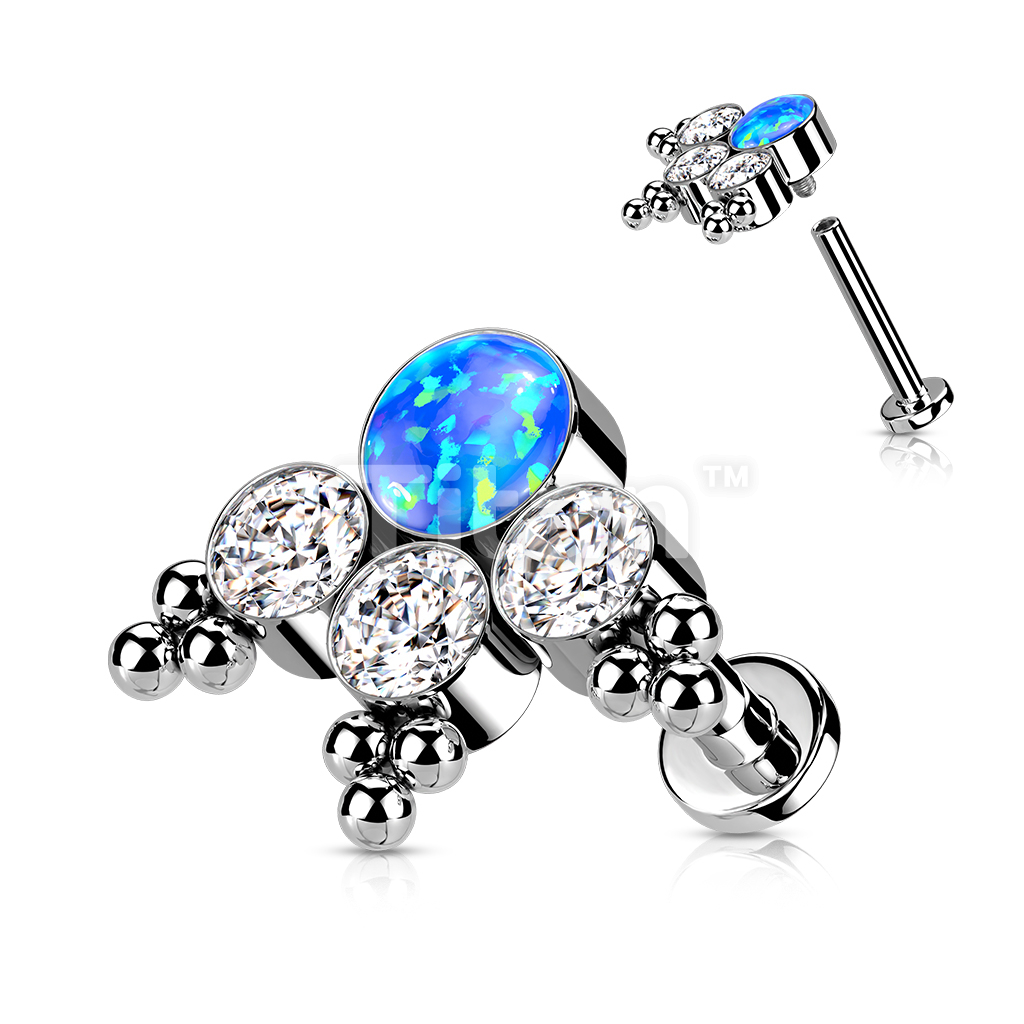 Implant Grade Titanium Internally Threaded Labret With Round Opal or CZ Center Cluster Fan With Beaded Ball Top