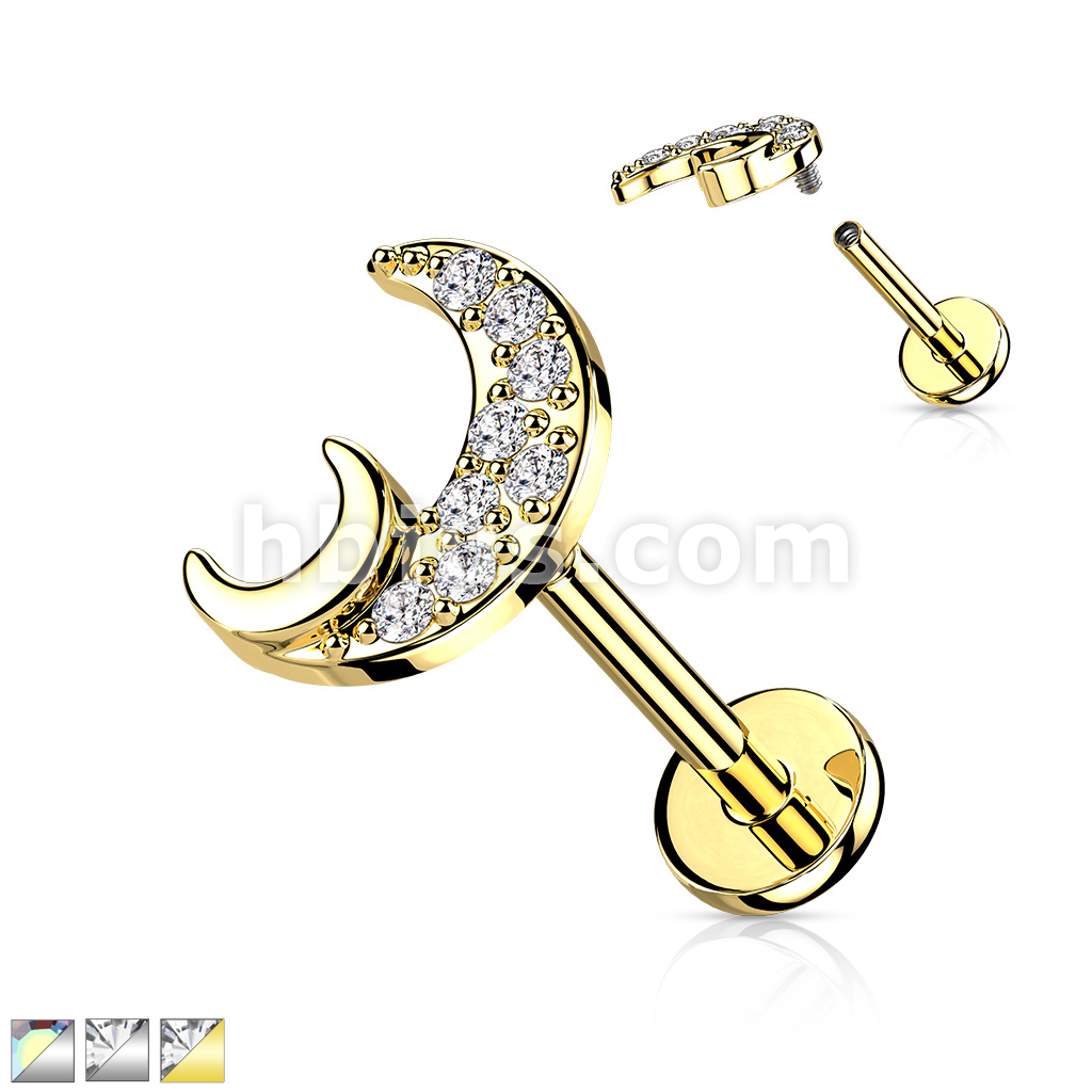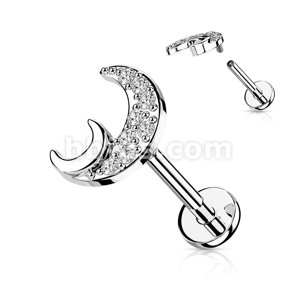CZ Paved Crescent Moon Internally Threaded 316L Surgical Steel Flat Back Studs for Labret, Monroe, Cartilage and More