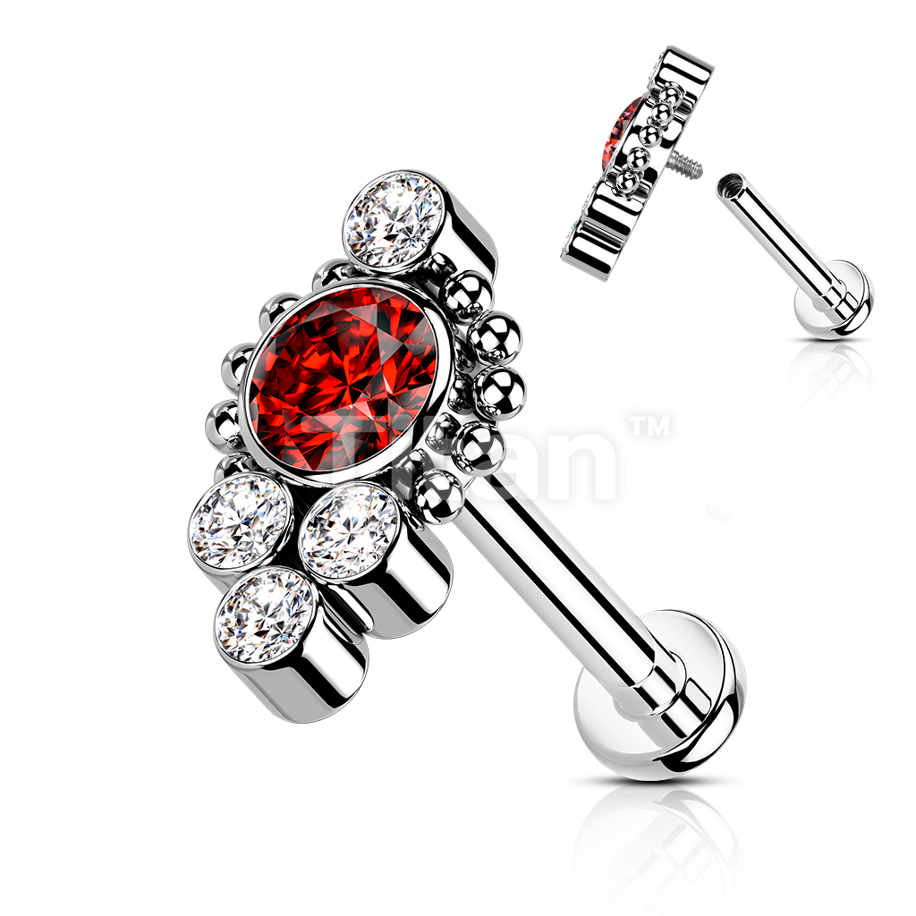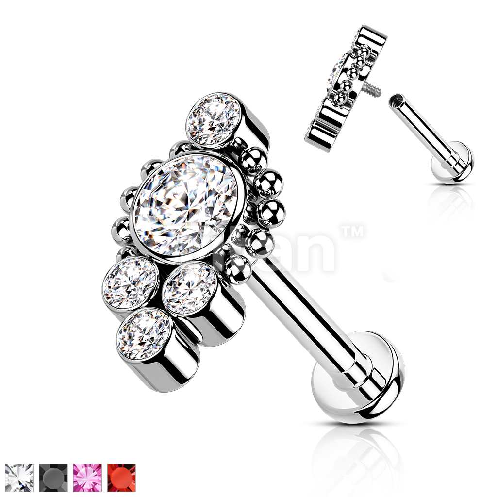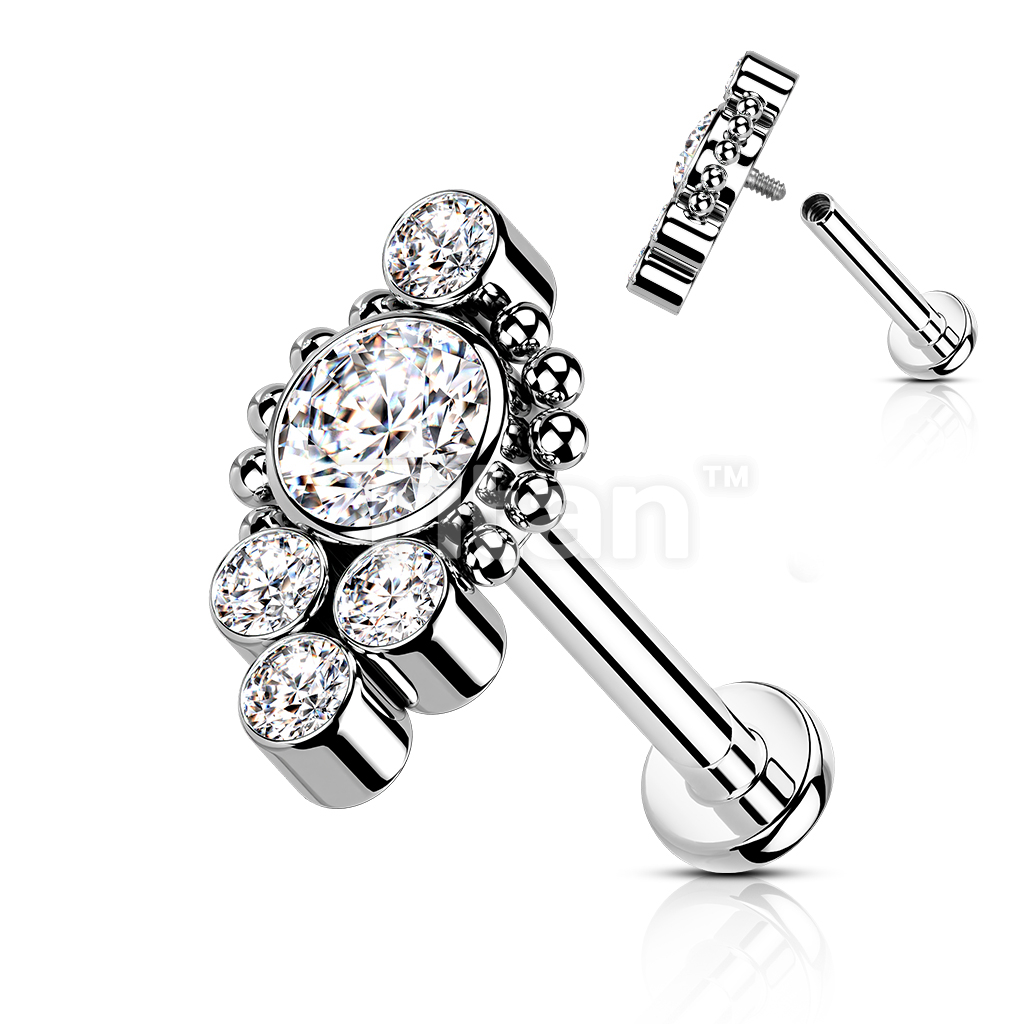 Implant Grade Titanium Internally Threaded Labret With CZ Cluster and Beaded Ball Center Edge