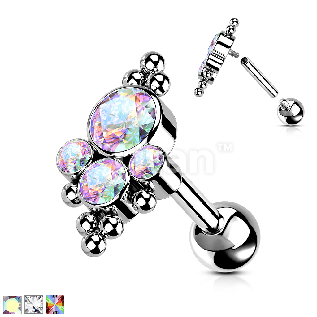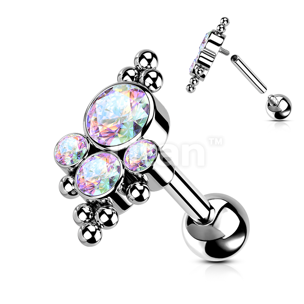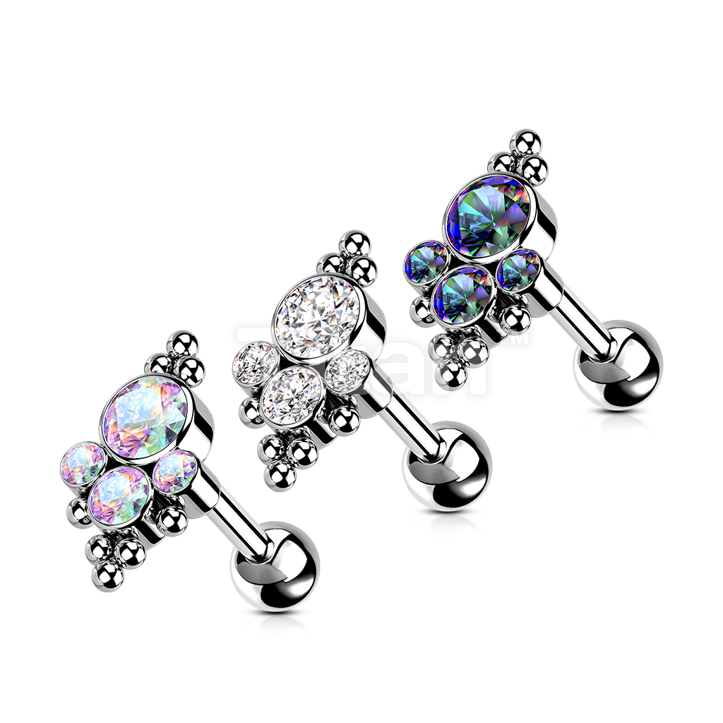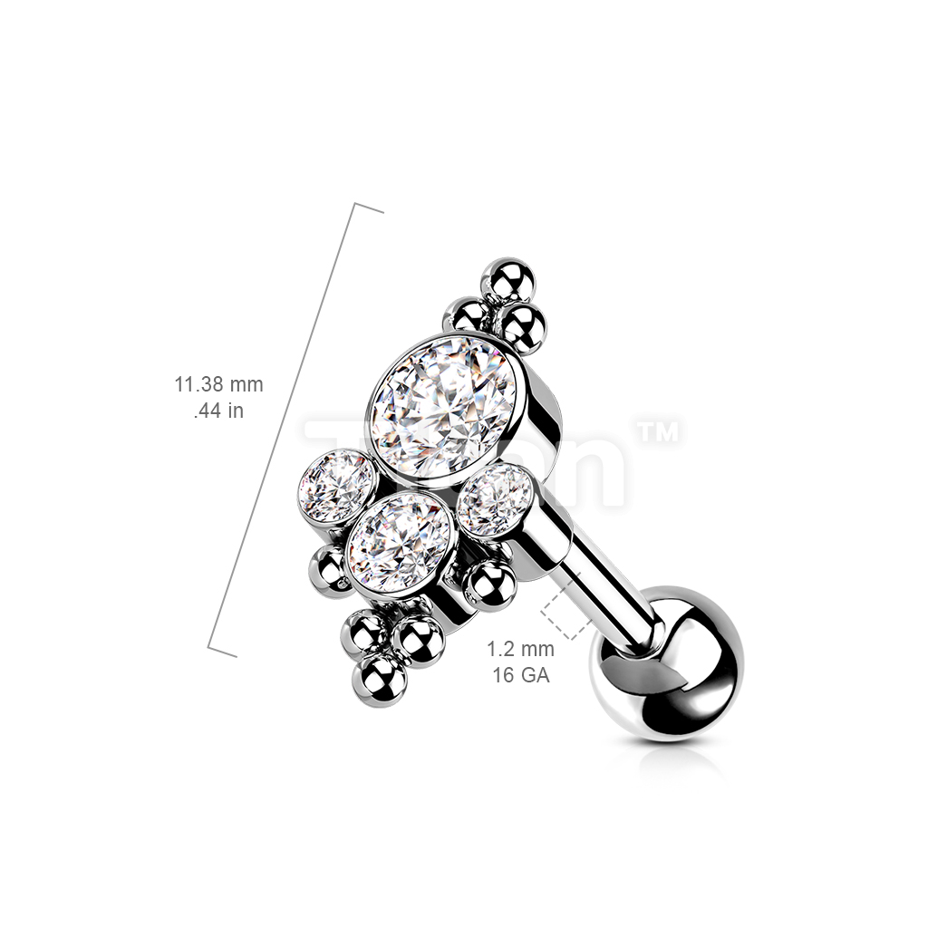 Implant Grade Titanium Internally Threaded Cartilage Barbell With Bezel Set CZ Cluster Center and Beaded Ball Edge Top