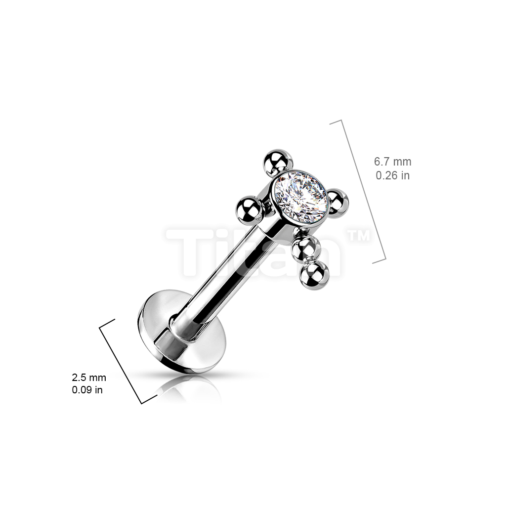 Implant Grade Titanium Threadless Push In Labret With Bezel Set CZ or Opal Center Beaded Ball Cross Top