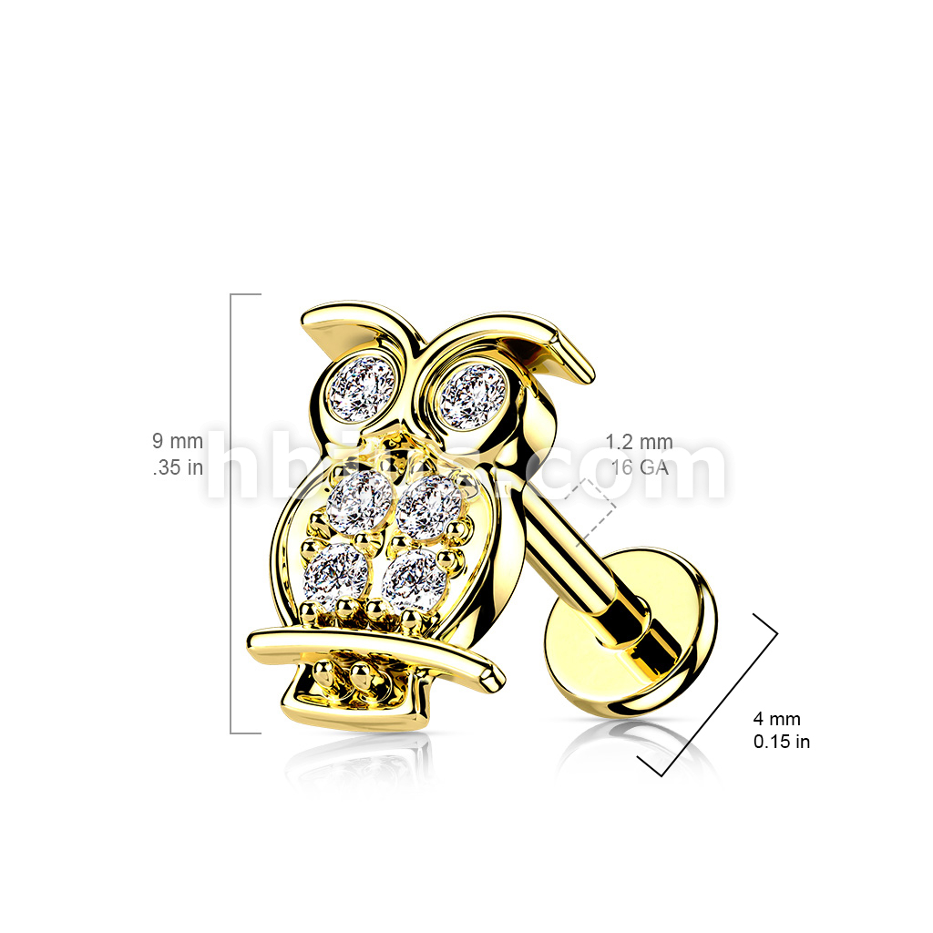 CZ Paved Owl Top on Internally Threaded 316L Surgical Steel Flat Back Stud for Labret, Monroe, Cartilage and More