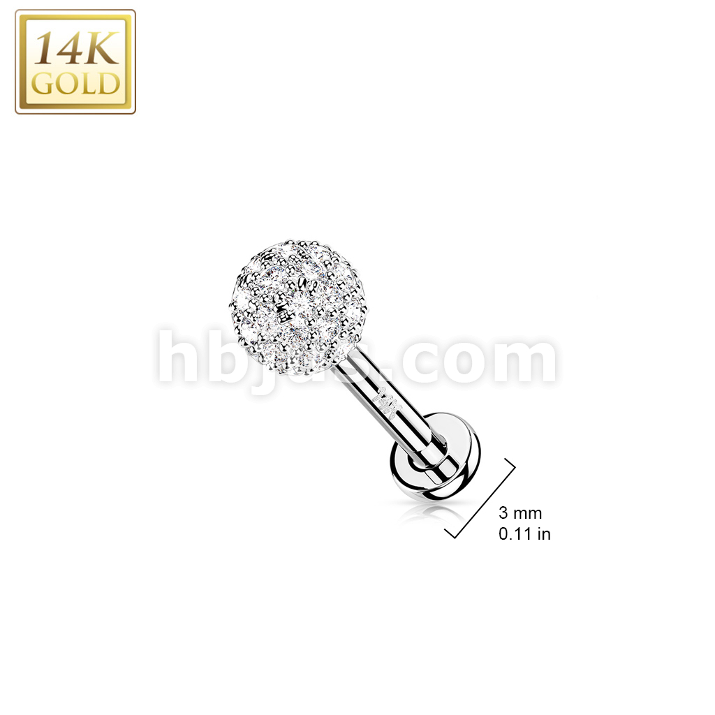 14K Gold Labret/Flat Back Stud With CZ Paved Ball Top