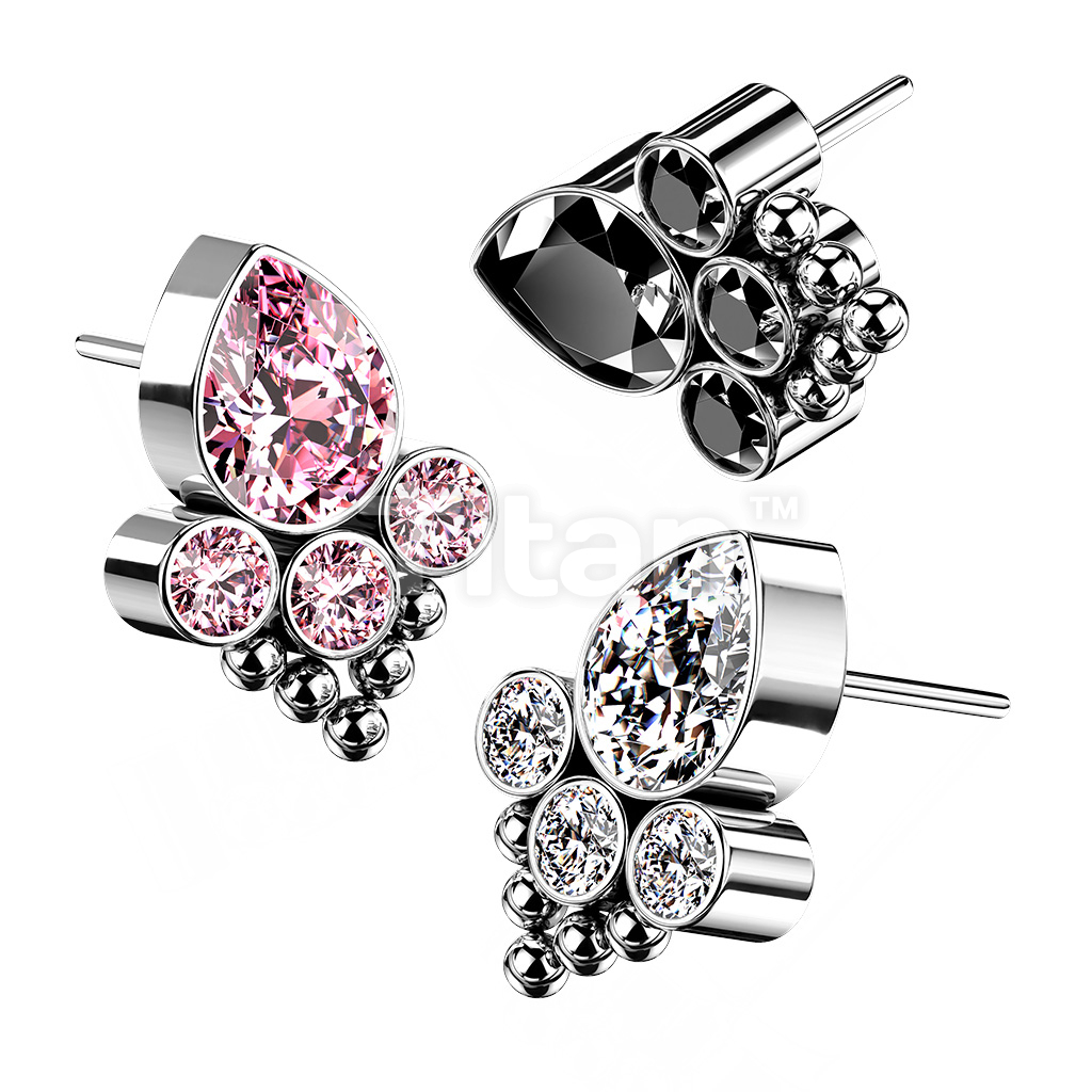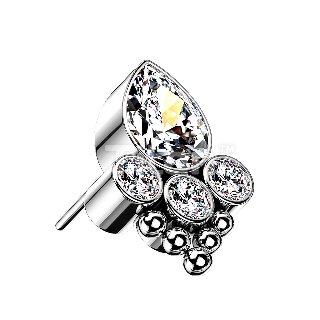 Implant Grade Titanium Threadless Push In Bezel Set CZ and Ball Cluster with Pear Center CZ Top