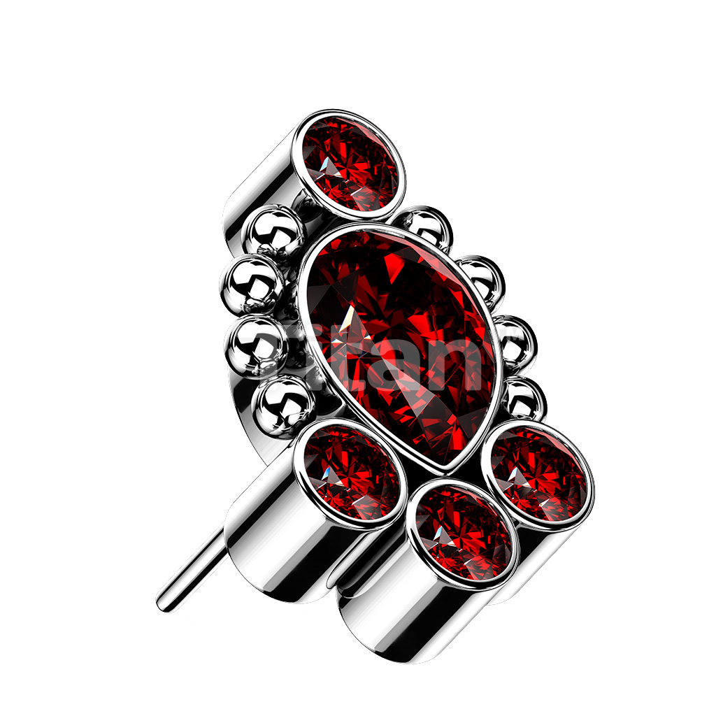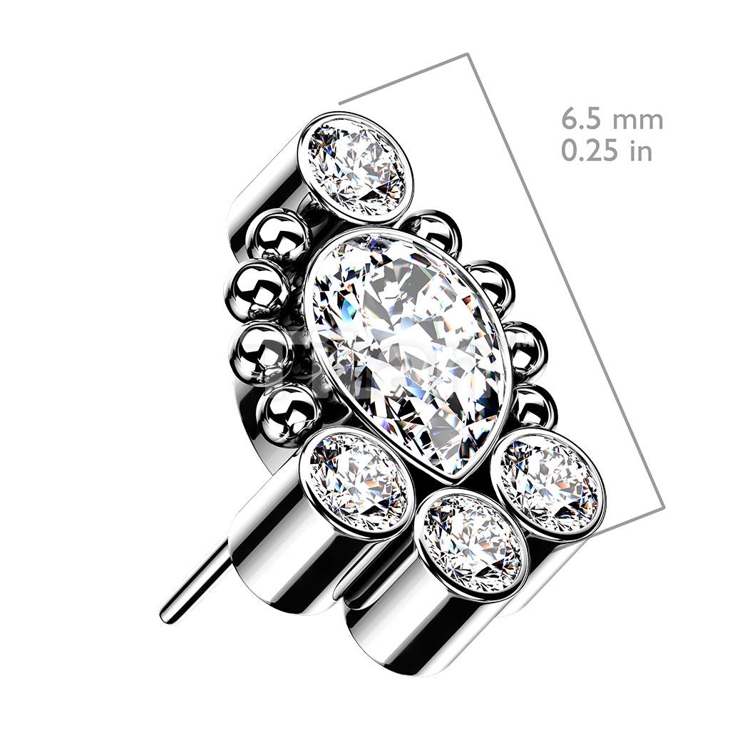 Implant Grade Titanium Threadless Push In Bezel Set CZ Cluster With Pear Shaped Center and Beaded Ball Edge Top