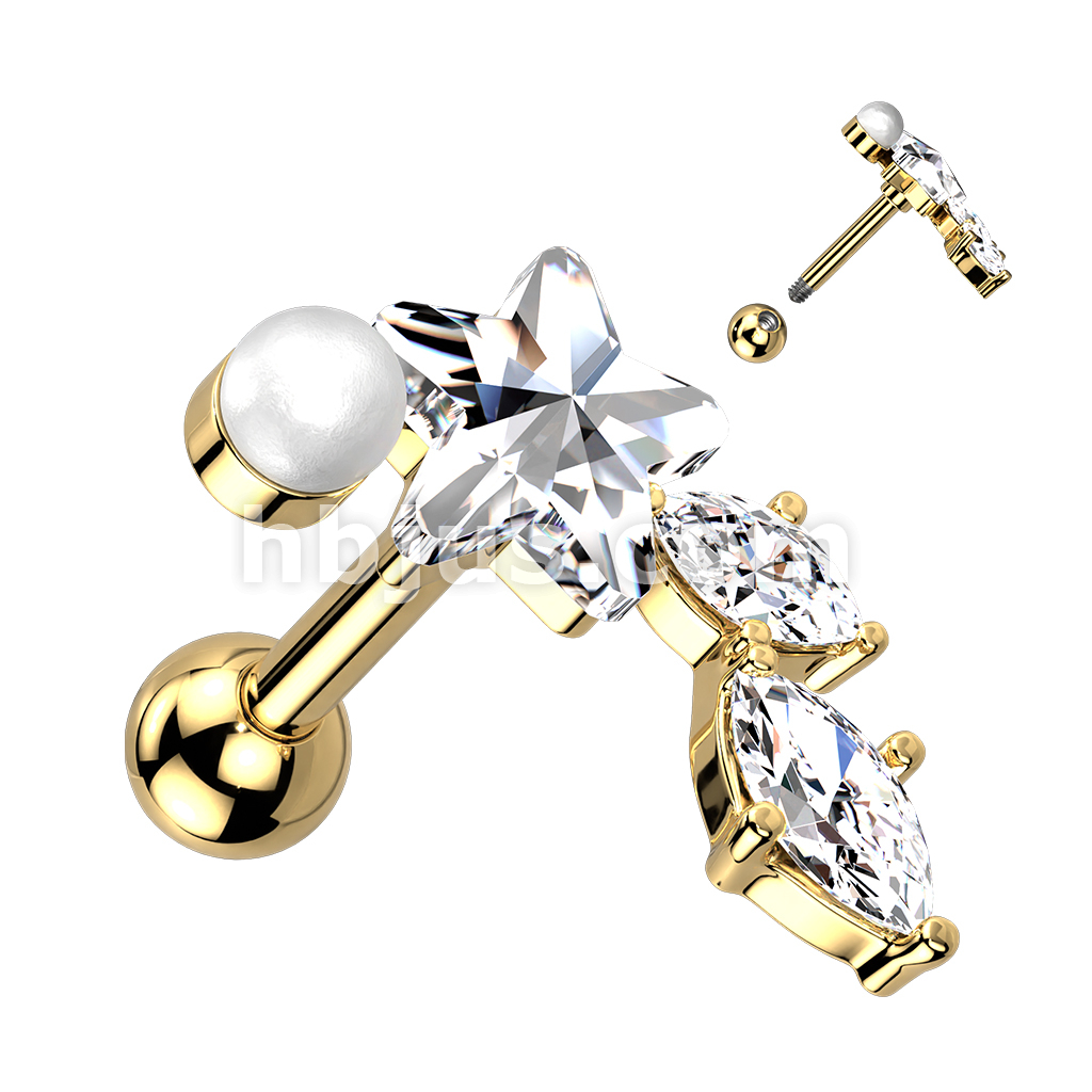 Star CZ with Marquise CZ Vine and Pearl 316L Surgical Steel Cartilage, Tragus Barbell Stud