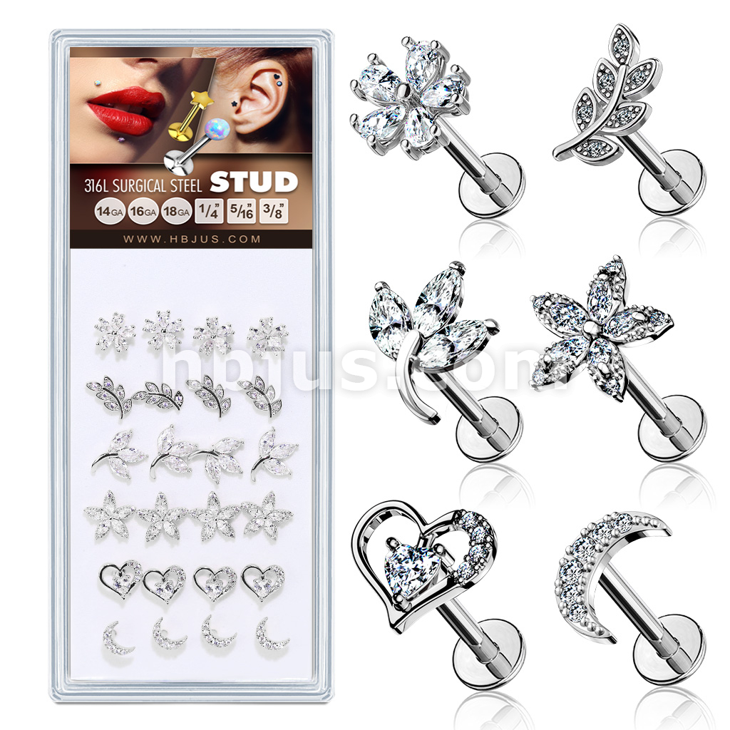 24 Pcs Pre Loaded Box of Assorted Styles with CZs 316L Surgical Steel Internally Threaded Labrets, Monroe, and Cartilage Studs Pack