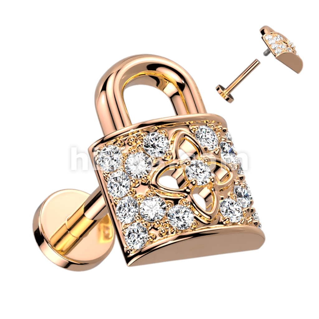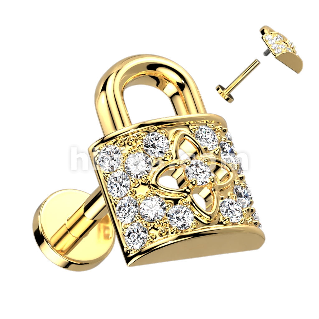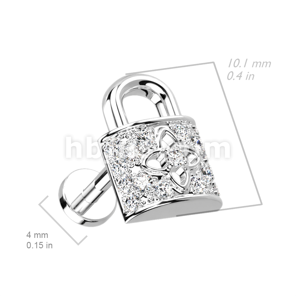 CZ Paved Lock Top on Internally Threaded 316L Surgical Steel Flat Back Stud for Labret, Monroe, Cartilage and More