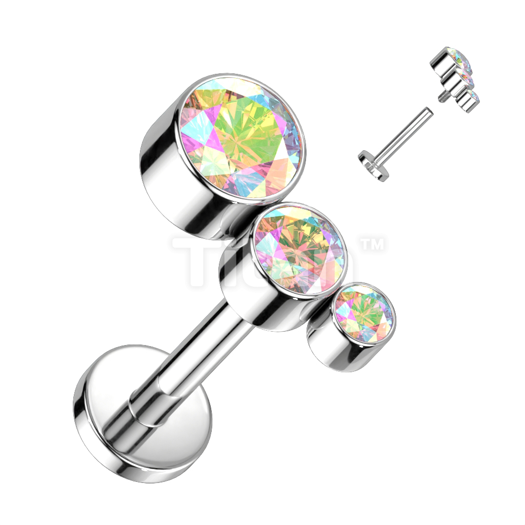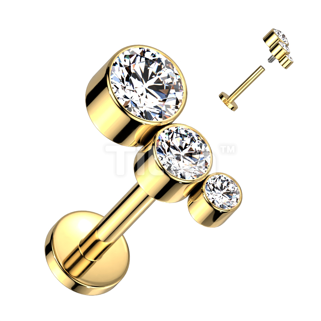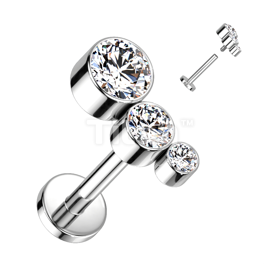 Implant Grade Titanium Internally Threaded Labret With Descending Bezel Set 3 CZ Curved Top