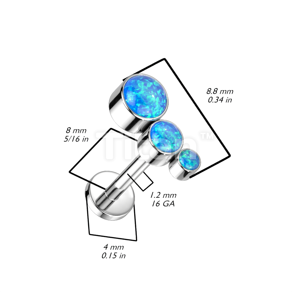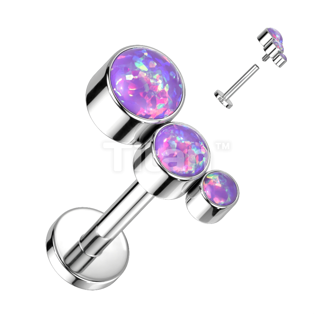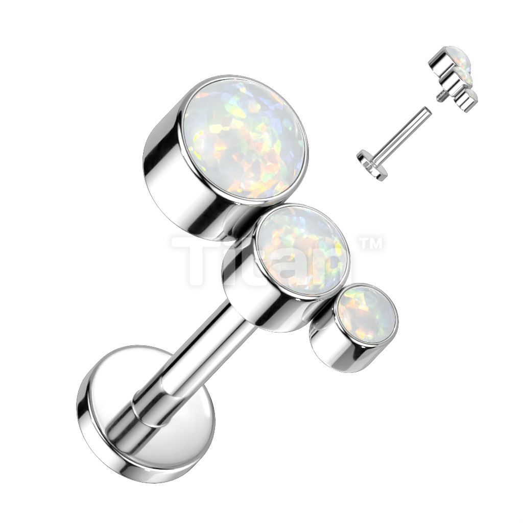 Implant Grade Titanium Internally Threaded Labret With Descending Bezel Set 3 Opal Curved Top