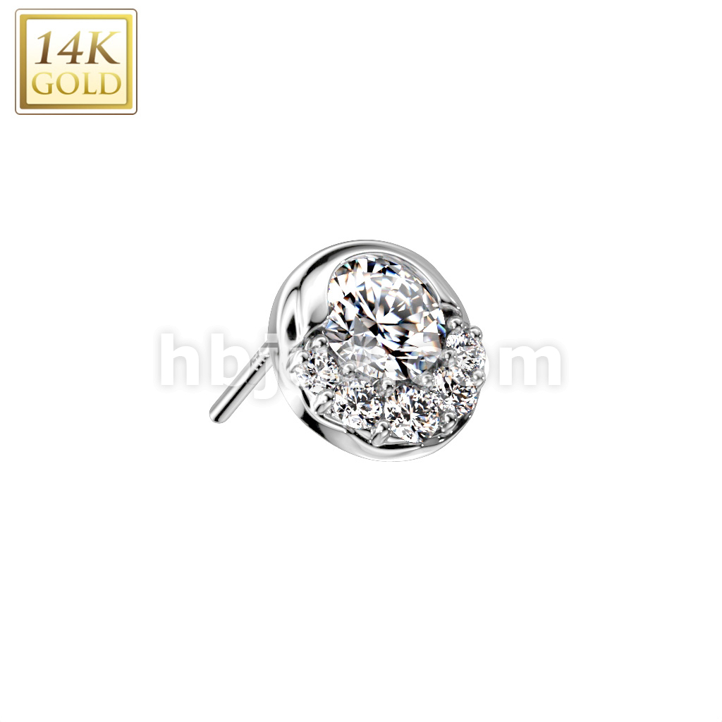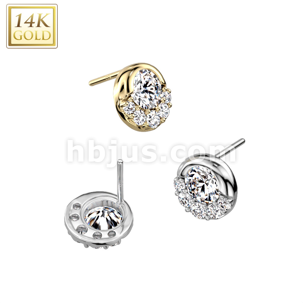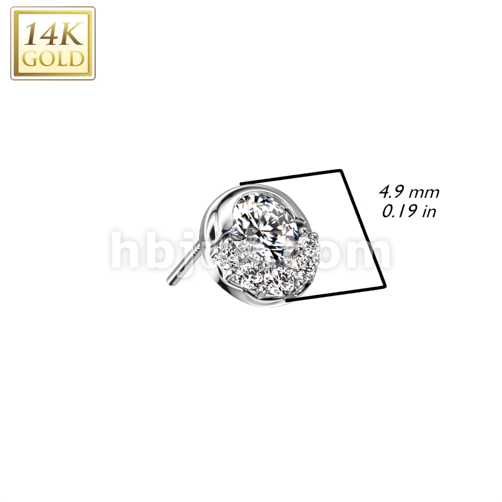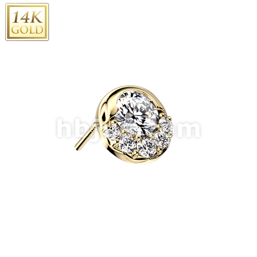 14K Gold Threadless Push In Round CZ and Small CZ Fan Decorated Top
