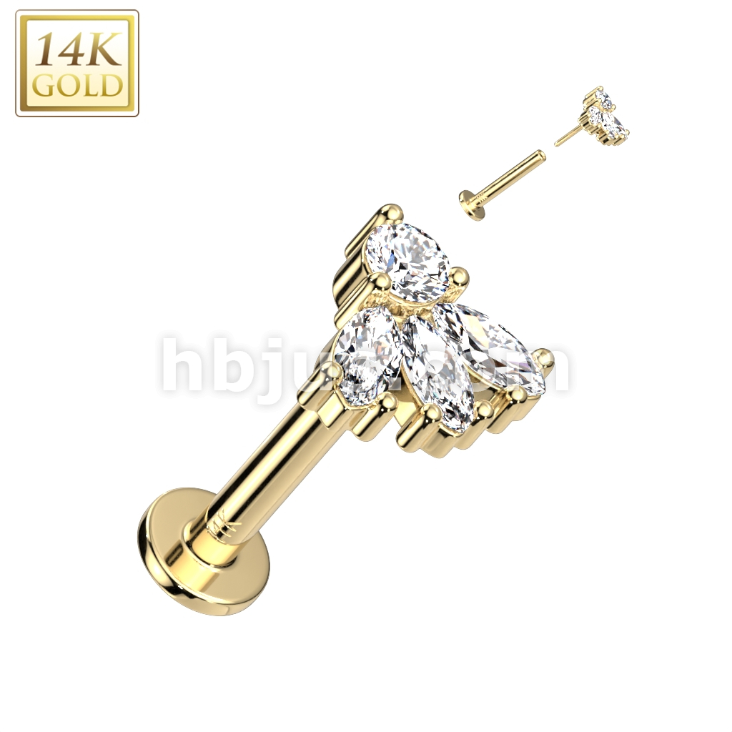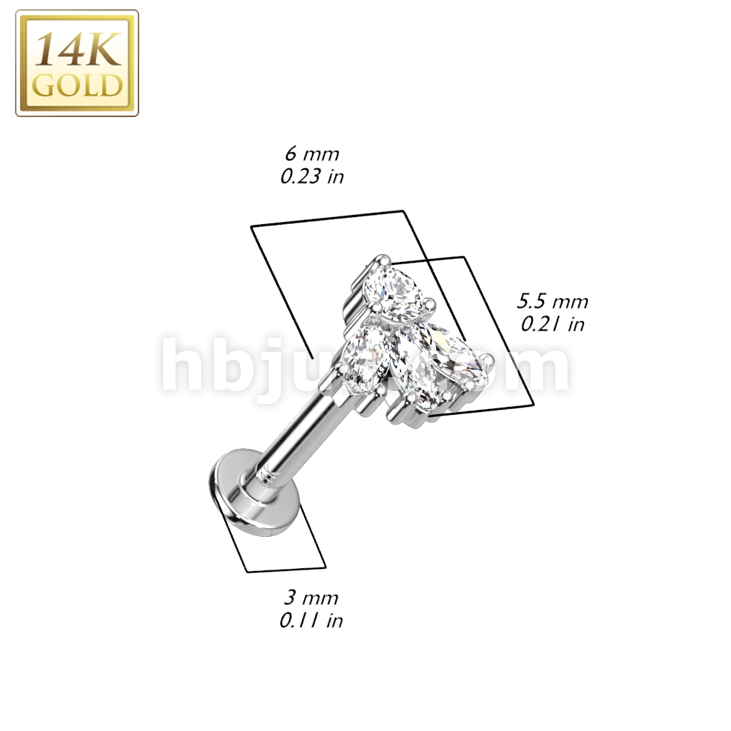 14K Gold Threadless Labret/Flat Back Stud With Round and 3-Marquise CZ Top