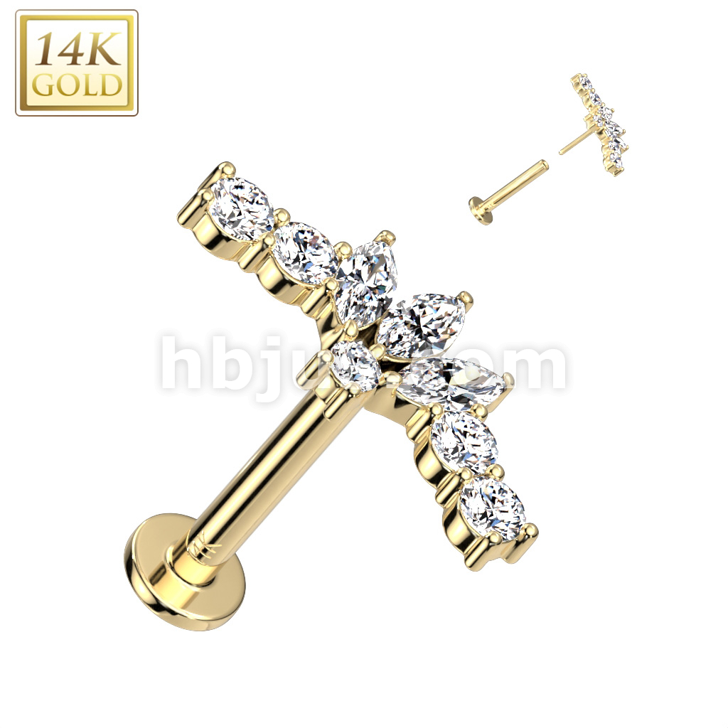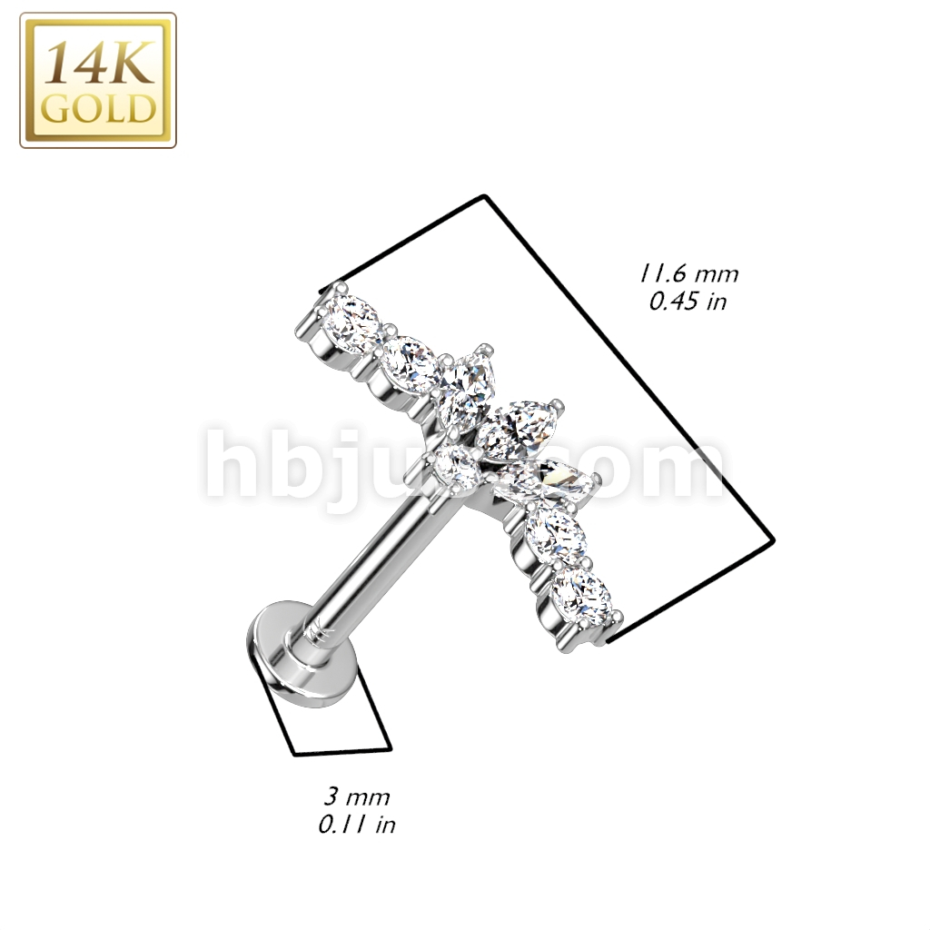 14K Gold Threadless Labret/Flat Back Stud Fan With 3 Marquise CZ Center Top