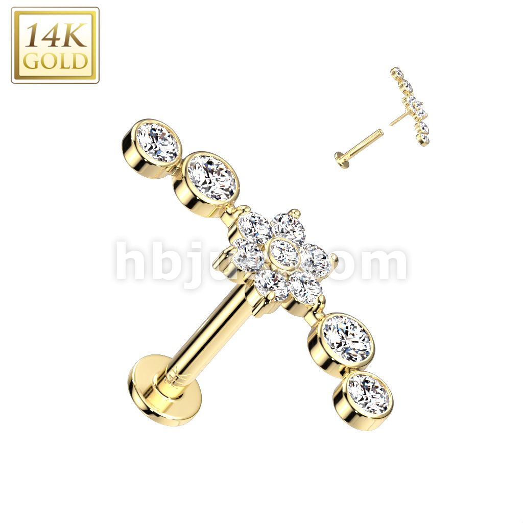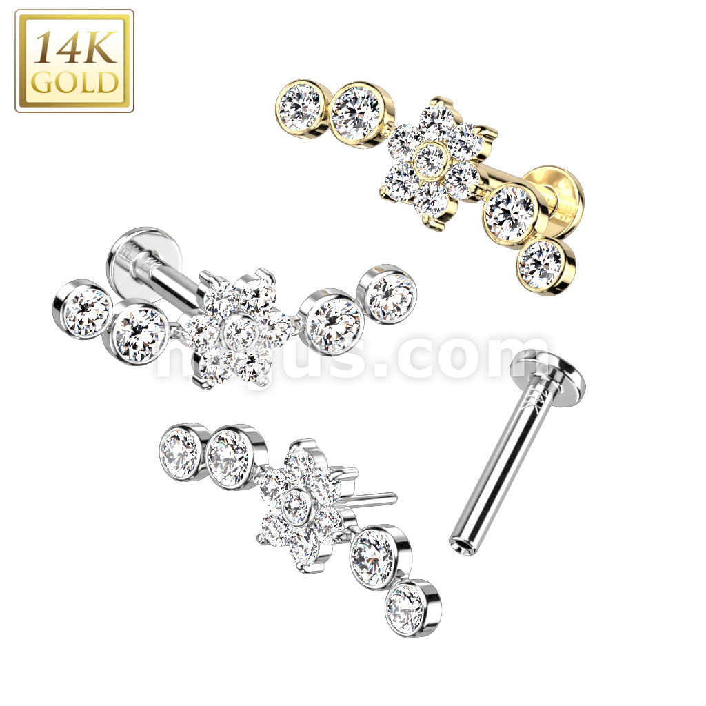 14K Gold Threadless Labret/Flat Back Stud With Flower Center and 2 CZ Ball on Each Side
