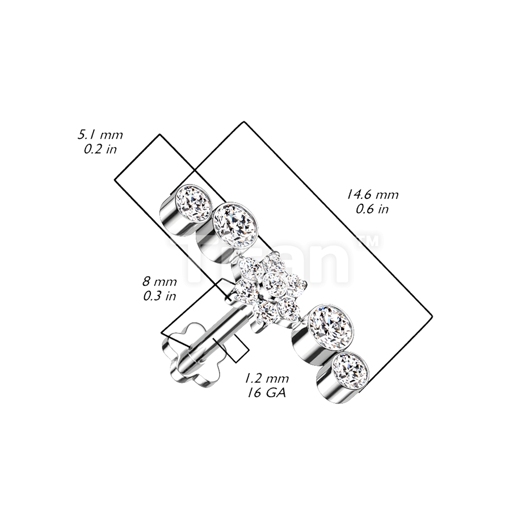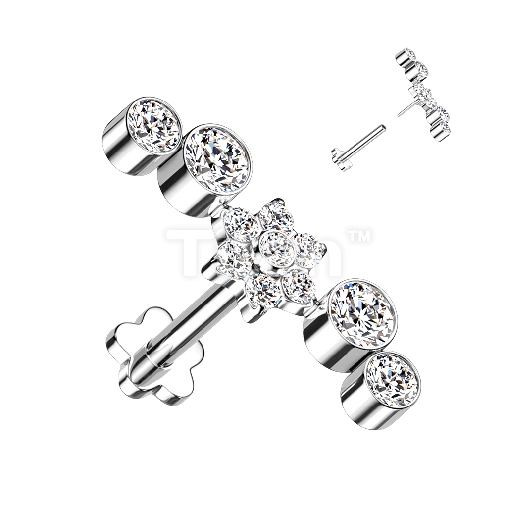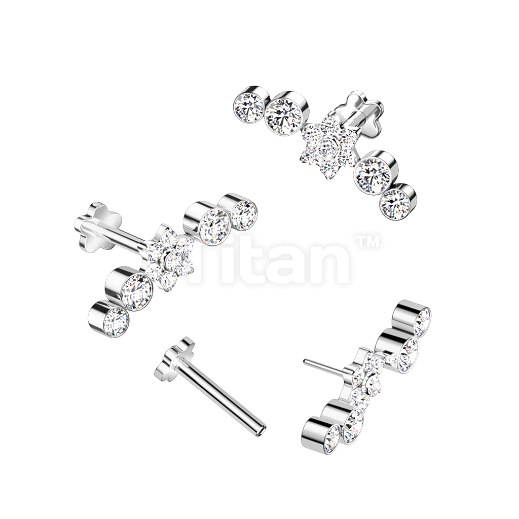 Implant Grade Titanium Threadless Push In Labret With Opal or CZ Flower Center and Double Bezel Set CZs on Each Side