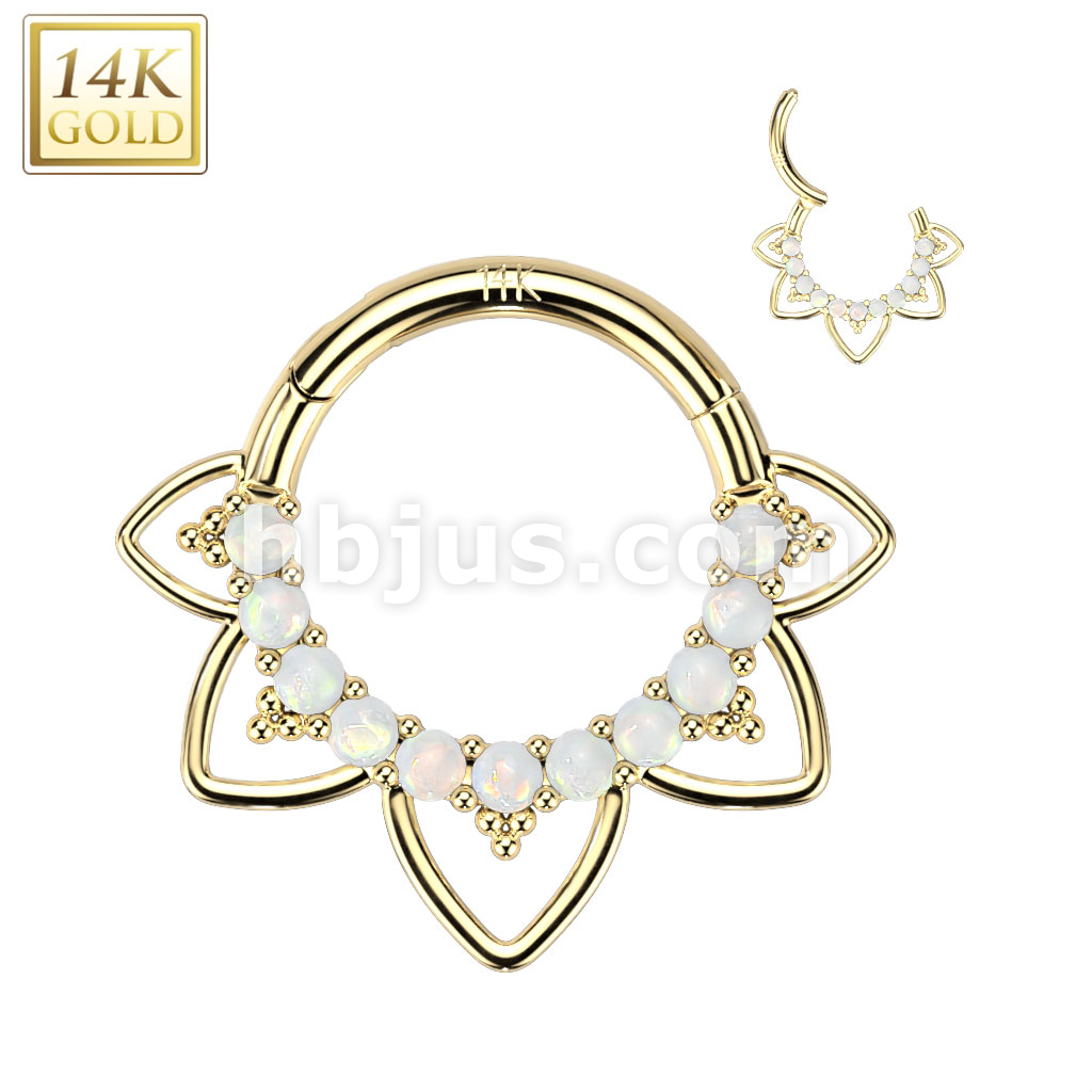 14K Gold Hinged Segment Hoop Ring With Front Facing Opal or CZ and Heart Filigree