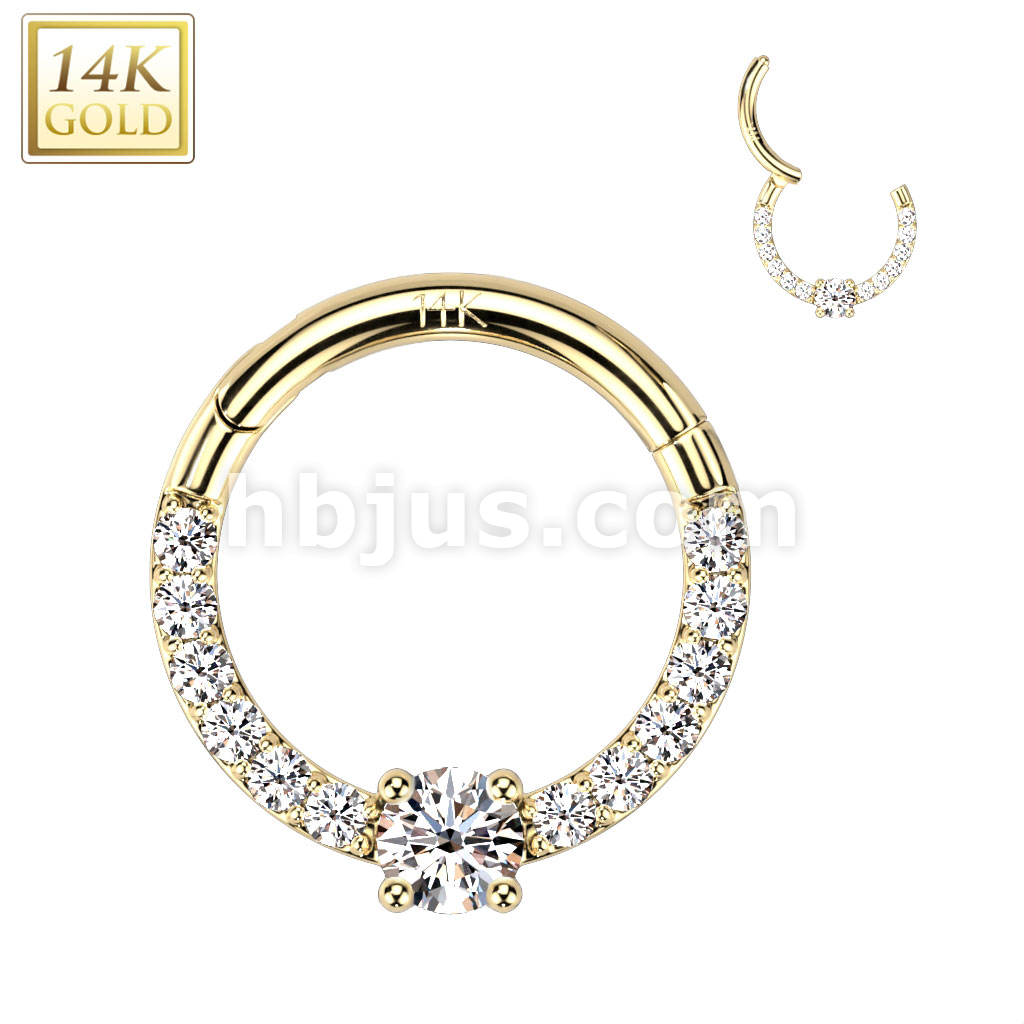 14K Gold Hinged Segment Hoop Ring With Front Facing Round CZ Center and CZ Paved Sides