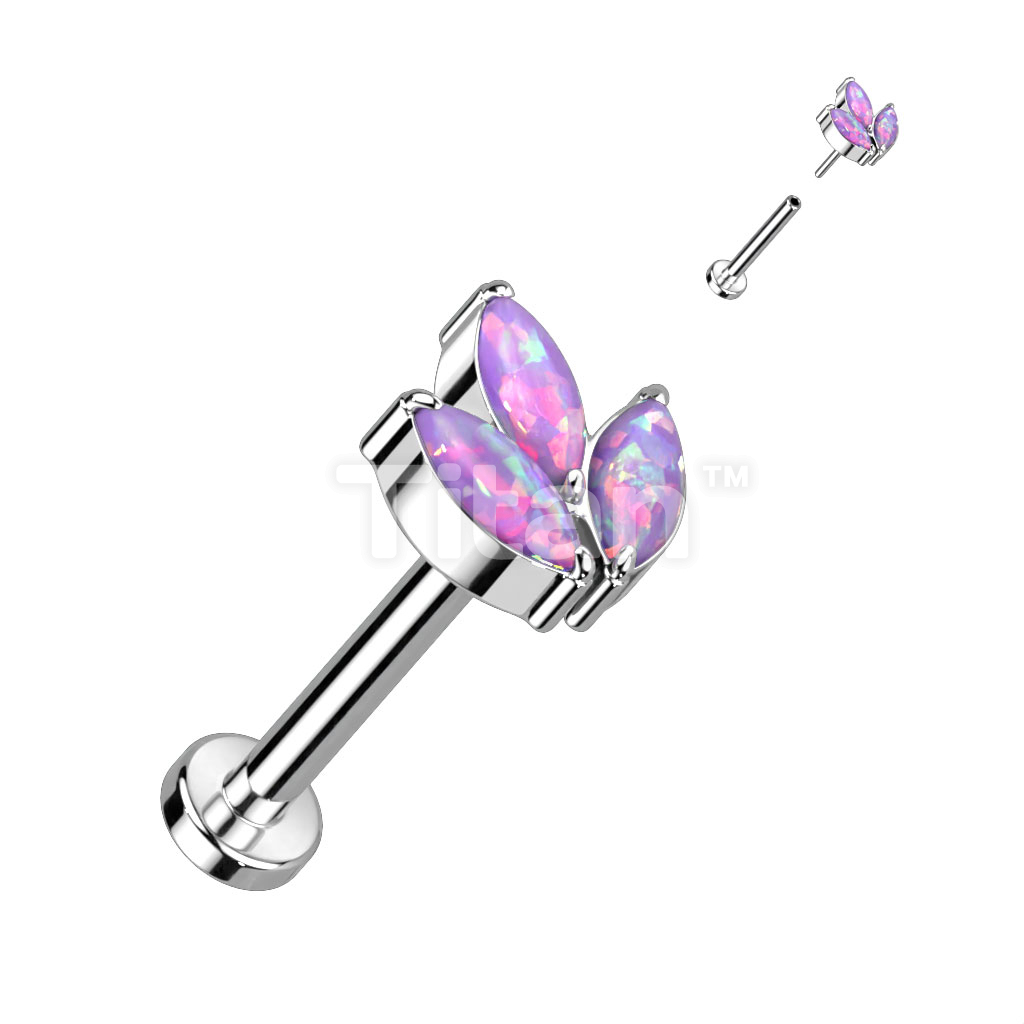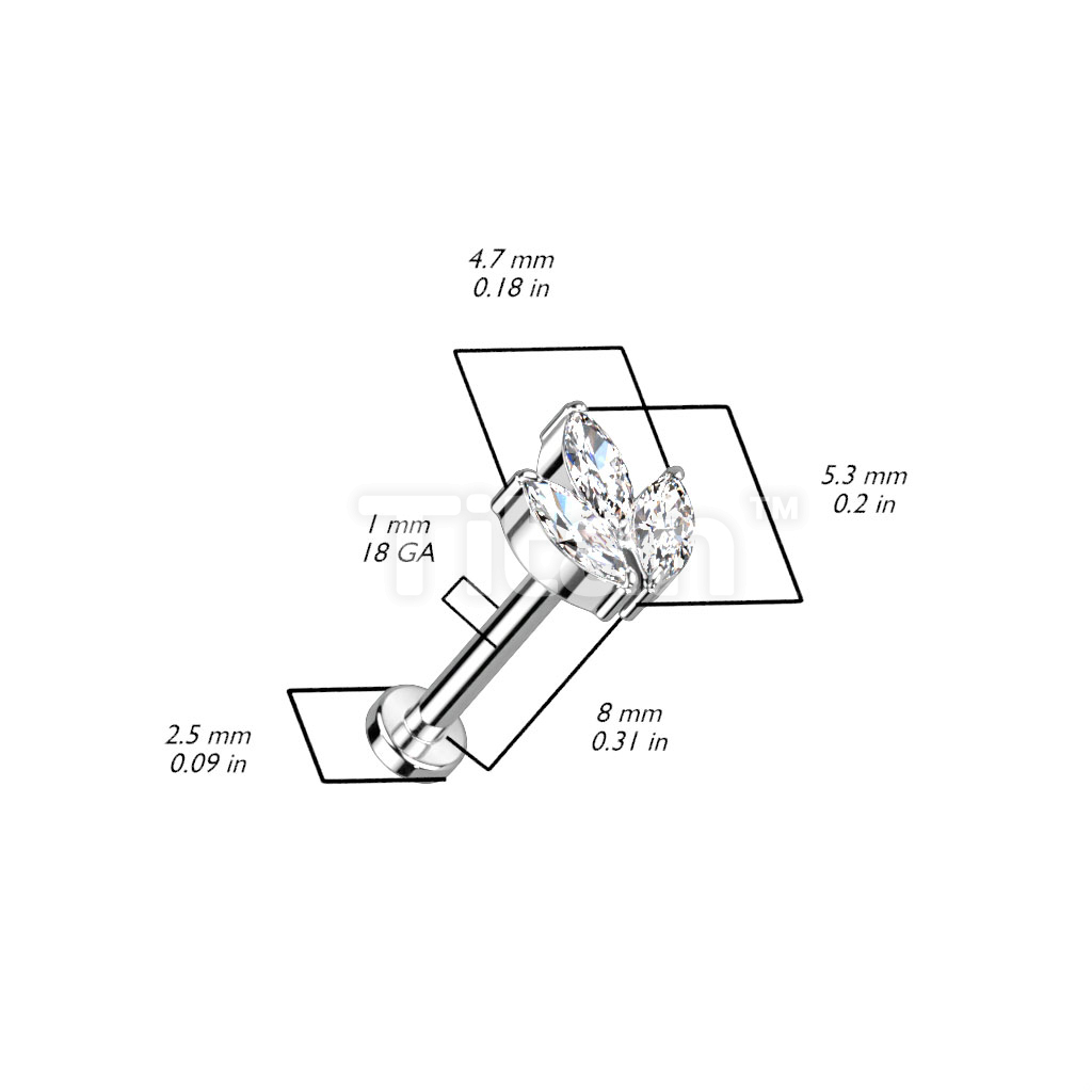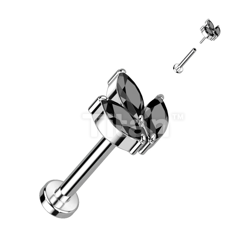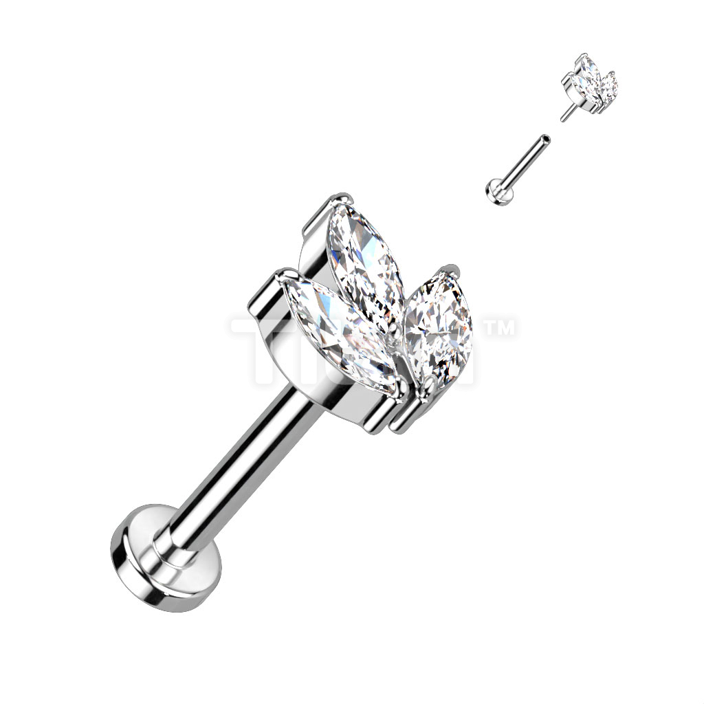 Implant Grade Titanium Threadless Push In Labret With 3 Marquise CZ or Opal Leaf Top