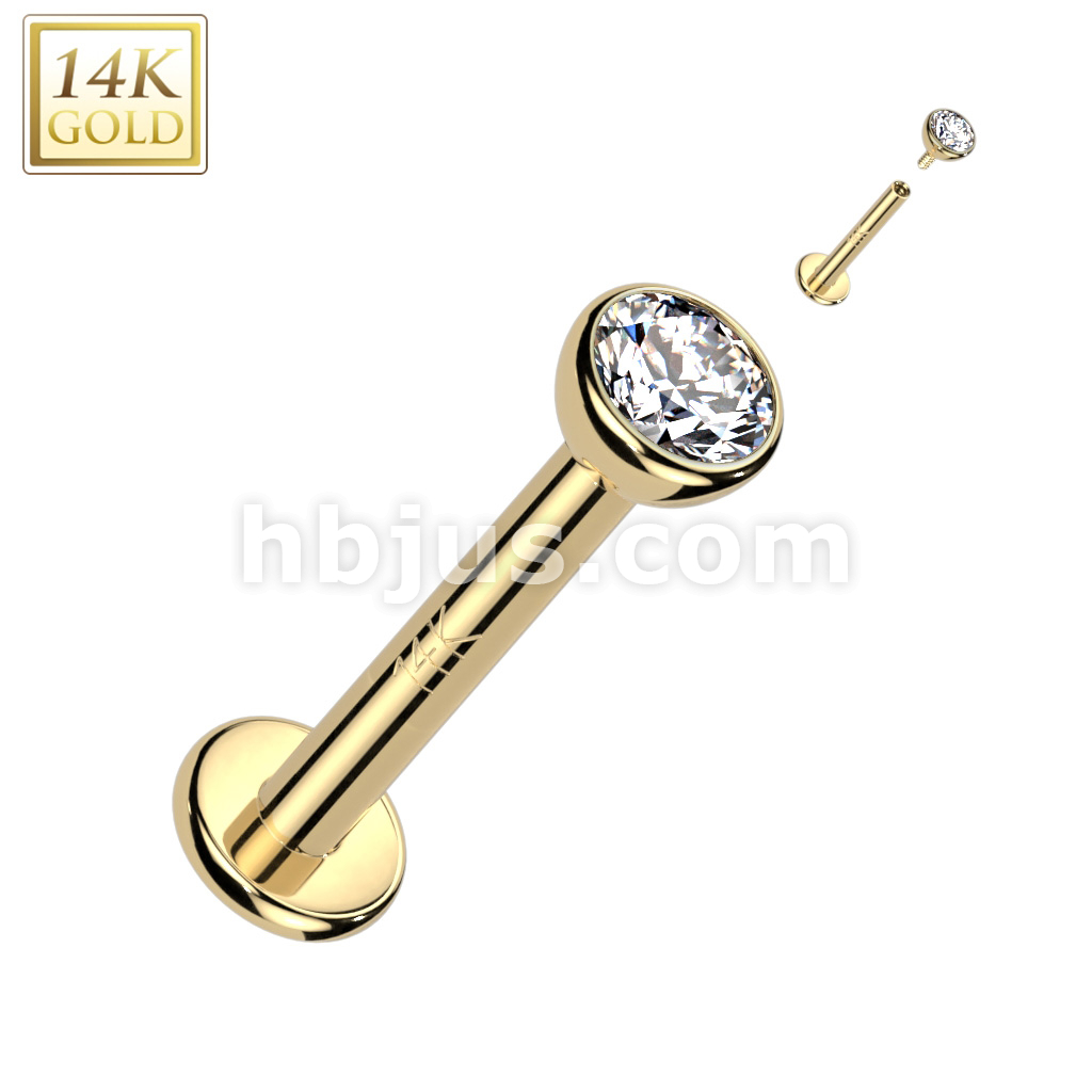 14K Gold Internally Threaded Labret, Flat Back Stud With Wide Face CZ Bezel Set Ball