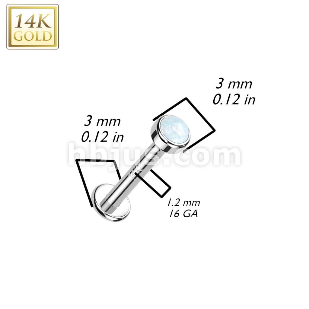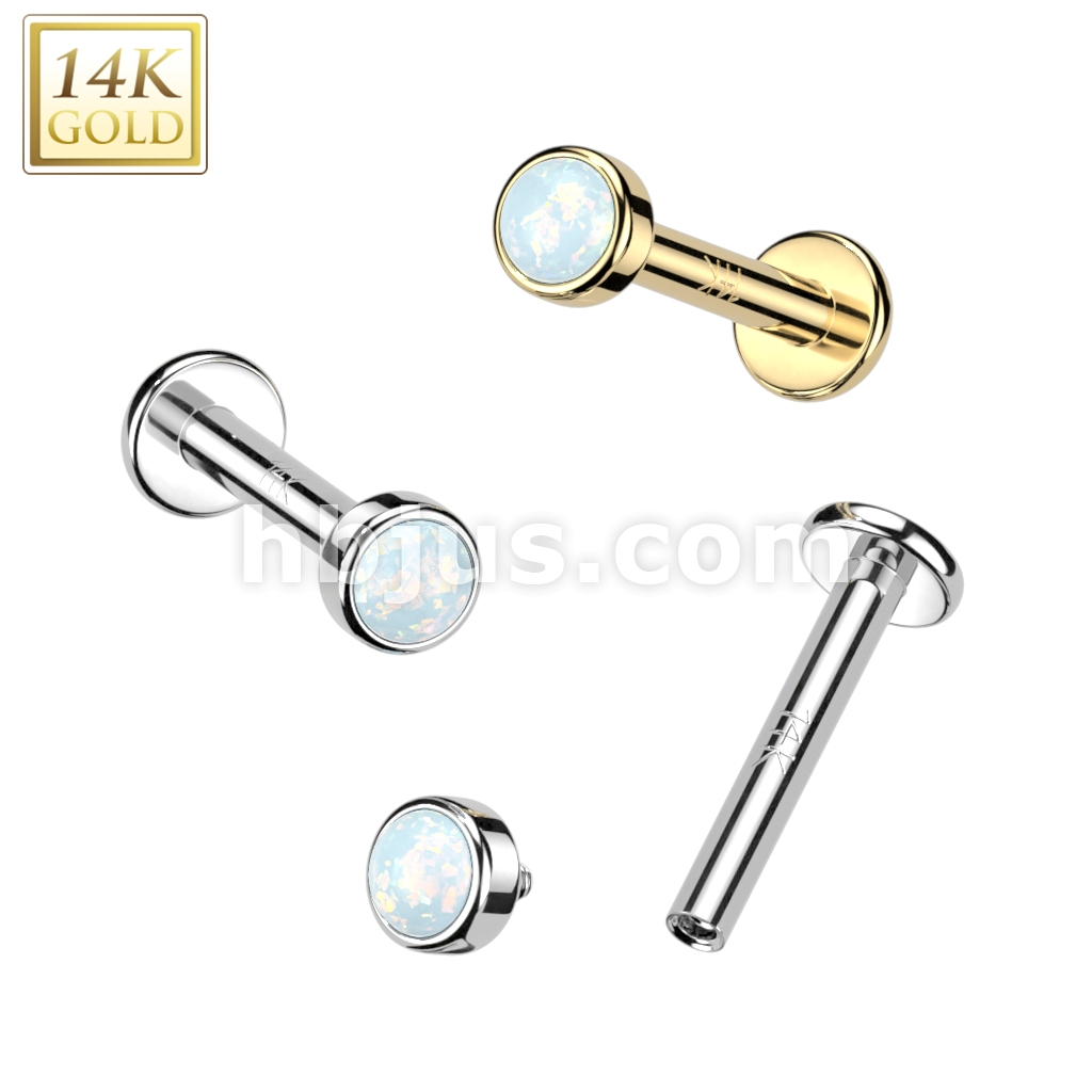 14K Gold Internally Threaded Labret, Flat Back Stud With Flat Back Bezel Set Opal Top