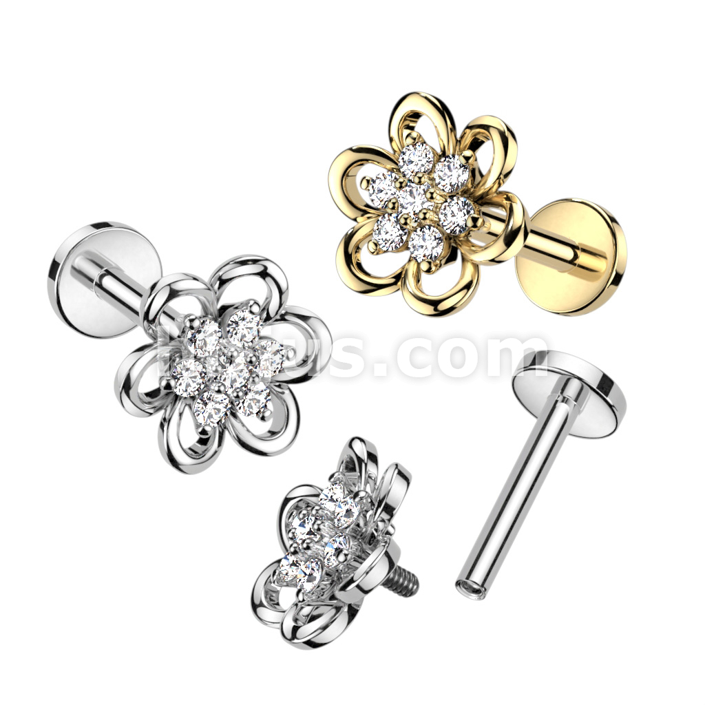 Hollow Flower With CZ Center Top 316L Surgical Steel Internally Threaded Labret, Flat Back Stud